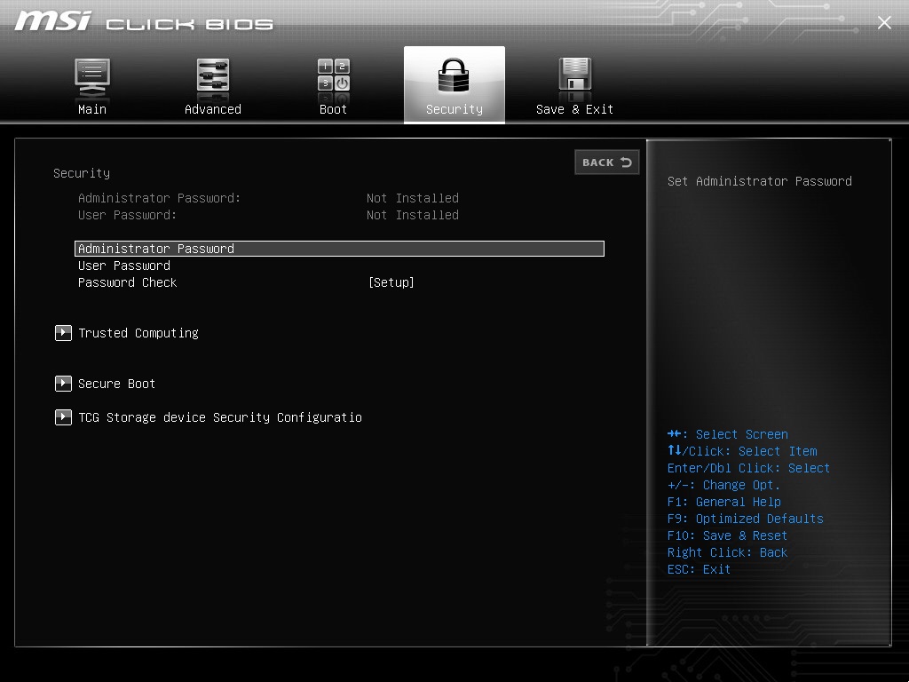 Onder de kop Security kunnen we de beveiliging van de laptop bepalen. Er kan namelijk een wachtwoord op de administrator user gezet worden zodat instellingen niet zomaar aan te passen zijn. Met het User Password moet er perse een wachtwoord ingevoerd worden als de laptop opgestart wordt. Weet je deze niet dan is het niet mogelijk de machine te starten. Trusted Computing kan gebruikt worden voor het versleutelen van de gegevens op de laptop. Daarvoor is een speciale chip aanwezig op de laptop die ook ingeschakeld kan worden. Secure Boot is tegenwoordig nodig om Windows 11 te kunnen gebruiken. Zo wordt voorkomen dat kwaadwillende mensen niet zomaar software kunnen draaien naar het OS toe. Met TCG is er nog veel meer in te schakelen waardoor je gegevens nog veel veiliger zijn.
