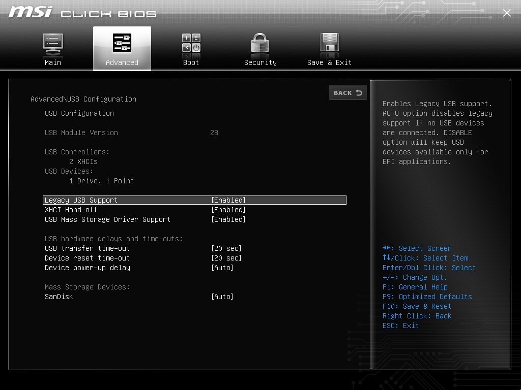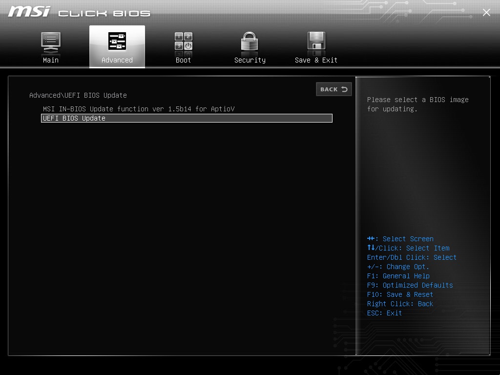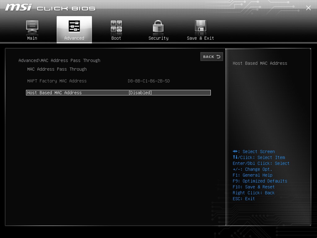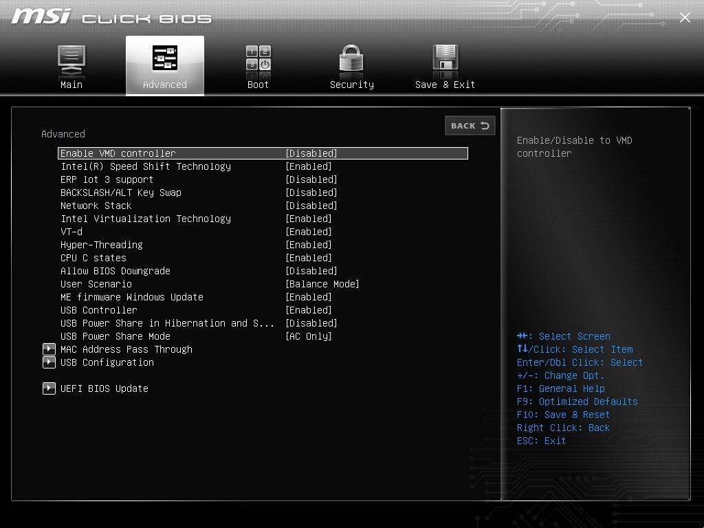 Het Advanced scherm toont een hoop opties die aan te passen zijn. Denk hier aan het inschakelen van de USB poorten, het mogelijk maken om virtuele machines te gebruiken op de laptop of Hyper Threading in te schakelen zodat er een extra core per echte core gesimuleerd kan worden. Er is ook een optie aanwezig om het MAC adres van de netwerk kaart te gebruiken in plaats van een virtueel adres. Dit kan soms handig zijn om zo sommige beveiligingen te gebruiken die alleen jouw adres toestaan. De volgende optie laat de gebruiker verschillende zaken omtrent USB aanpassen. Zo kan Legacy USB support aangezet worden zodat oudere apparaten gebruikt kunnen worden of kan het mogelijk zijn een timeout in te stellen. Het laatste scherm maakt het mogelijk om een BIOS update toe te passen op de laptop. Normaal gesproken is dit niet echt nodig maar het kan zijn dat er toch fouten ontdekt worden en via een update opgelost worden. Dit is dan de manier om het bij te werken.