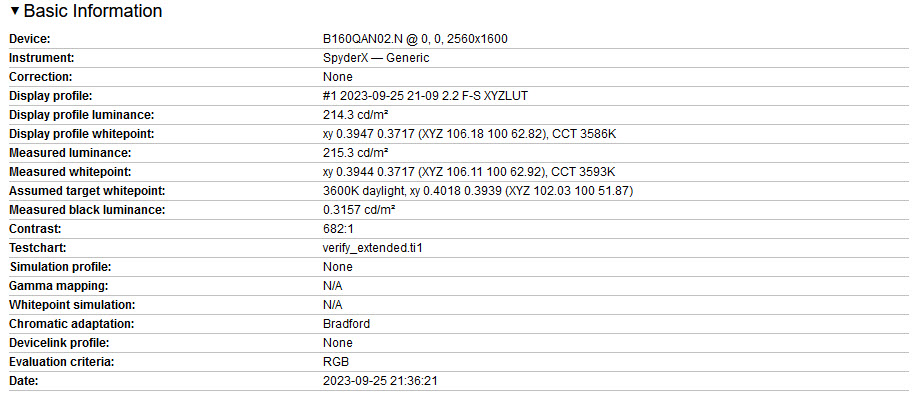 Volgens de gegevens hebben we te maken met bovenstaande gegevens. Het instrument wat we gebruiken om het scherm te meten is de SpyderX Pro, een meetapparaat van Datacolor. Dit apparaatje is wel een van de betere meetinstrumenten om te zien of een scherm goed ingesteld is of niet. Ook is het profiel te zien wat gebruik wordt.