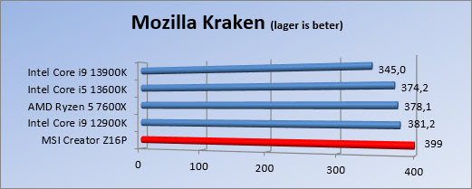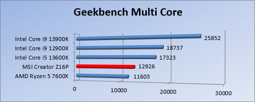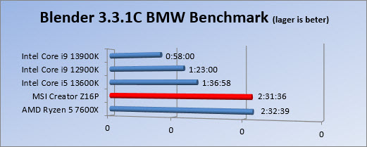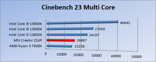 De laptop kan aardig meekomen met eerder geteste desktop systemen. Het is wel stuivertje wisselen met de 7600X, een desktop processor die wat nieuwer is dan de processor uit deze laptop. Een paar tests zijn op het moment van schrijven (September 2023) nog niet helemaal goed gegaan maar deze worden op het moment nog opnieuw getest. De videokaart lijkt niet goed het werk op te pakken waardoor resultaten vertekend weergegeven worden. Dit is het geval bij PC Mark en Procyon. Deze worden later nog geplaatst. Al met al geen verkeerde scores voor een draagbare computer.
