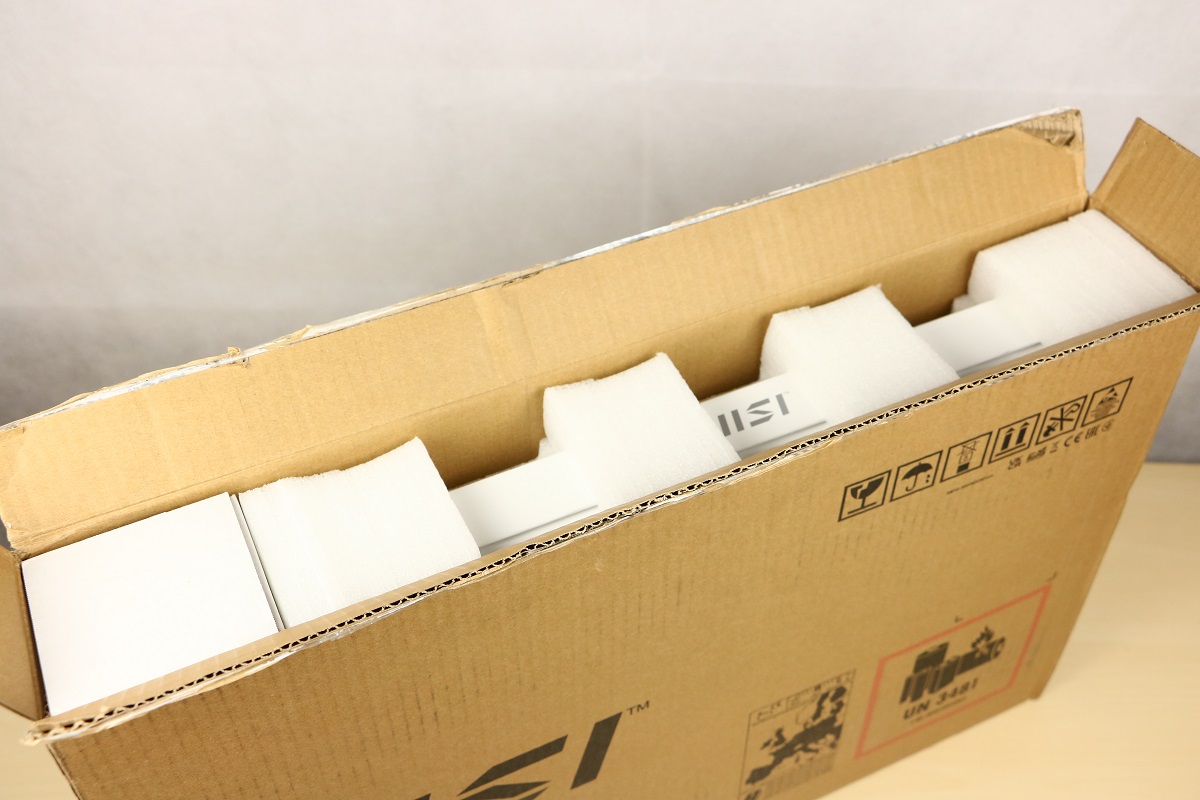 Net zoals de eerder gereviewde Raider laptop komt deze laptop in een bruine doos. Op de voorkant van de doos zien we het drakenlogo van MSI staan, eentje die ze al een lange tijd gebruiken op voornamelijk hun gaming- en highend lijn. Draaien we de doos om dan zien we daar het zakelijke logo staan. Daar zien we ook verschillende waarschuwingen staan zoals hoe hoog de stapel mag zijn, dat het product een batterij bevat en dat het breekbaar kan zijn. Aan de zijkant zien we wat informatie staan van de laptop. Denk hierbij aan het serienummer, de naam en SKU. Dit is normaal gesproken gekoppeld met de specificaties. Maken we de doos open, zien we twee doosjes zitten waarvan de grootste variant bedekt is met schuim.