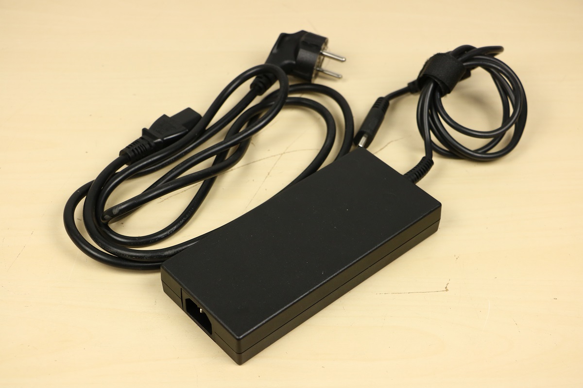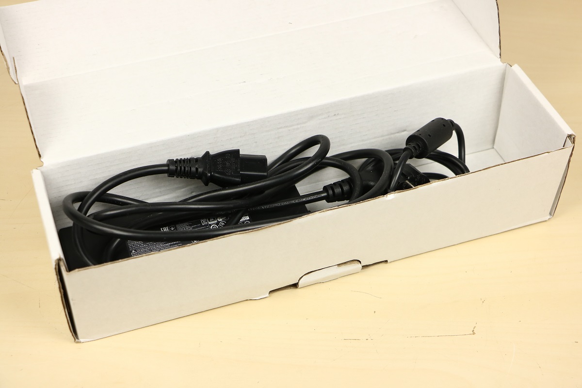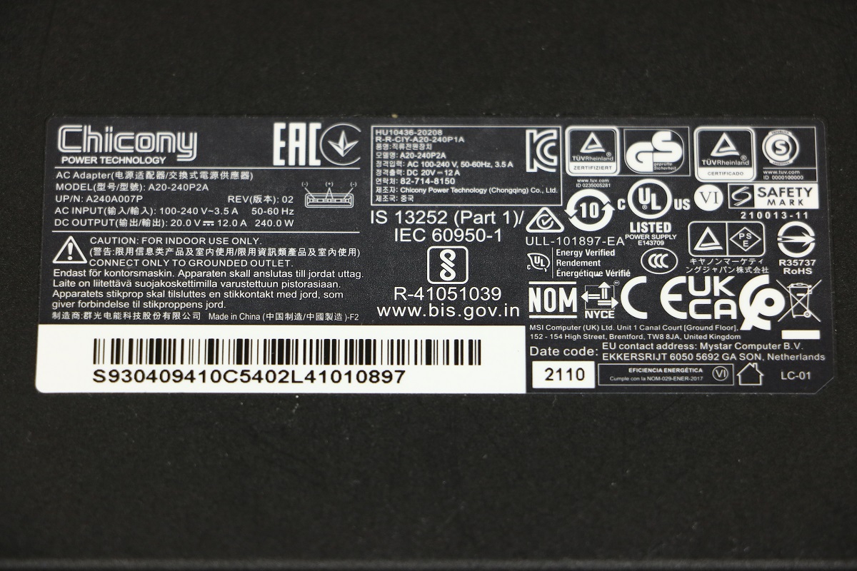 Het kleinste doosje van de twee ziet er niet heel spannend uit. Dit is een rechthoekig doosje met alleen een barcode sticker erop. Deze laat alleen zien wat voor onderdeel er in het doosje zit. Maken we deze open dan vinden we daar de adapter om de laptop mee op te laden. Deze is best fors te noemen maar dat is niet zo gek voor een laptop van dit kaliber. Het kan natuurlijk altijd groter, wat we al eerder gezien hebben bij de Raider en de Titan. Op de adapter zien we hoeveel stroom de adapter maximaal kan leveren aan de laptop. Tevens zien we hier verschillende logo's voor keuringen die uitgevoerd zijn op de adapter. Alles voor de veiligheid. Kijken we naar de aansluiting om de laptop mee op te laden dan lijkt deze op een USB aansluiting maar dat is het niet. Probeer deze dus niet in een USB poort te stoppen want dat gaat niet werken. Het past ook gewoon niet, het enige wat je op die manier bereikt is dat de USB poort in de laptop kapot gaat. De adapter wordt aan de andere kant van stroom voorzien door een standaard voedingskabel. Het voordeel is dat deze kabel over het algemeen al aanwezig is bij mensen. Mocht je deze kabel dus vergeten zijn dan kan elke andere kabel gebruikt worden.