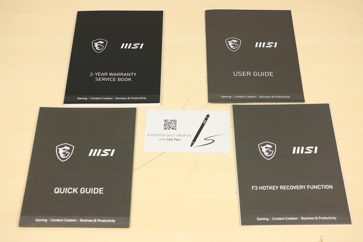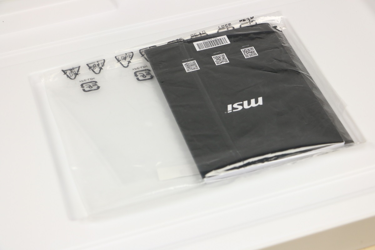 Er was nog een andere doos te vinden in de bruine doos. Deze is compleet in het wit uitgevoerd en is vrij dun. Op de zijkant van de doos zien we weer het zakelijke logo van MSI terug terwijl de op de bovenkant van de doos het Gaming logo terug zien. Op de bovenkant van de doos staat de tekst "Content Creation", iets waar deze laptop voor gemaakt is. Draaien we de doos om dan zien we daar de specificaties van de laptop terug. daaruit blijkt dat de laptop voorzien is van een 12900H, een 2TB SSD (waarbij niet bekend is welke SSD het is) en 32GB aan DDR4 geheugen. Helaas klopt dit niet want het is toch echt DDR5 wat op het moederbord geprikt is. Als laatste zien we de RTX3080Ti staan wat moet zorgen voor flink wat voordeel bij het maken van content. Halen we de deksel van de doos dan zien we daar meteen de laptop liggen. Halen we deze uit de doos dan zien we daar een plastic mapje met verschillende handleidingen. Dat zijn een garantieboekje, een gebruikershandleiding, een Quick Guide en een Recovery guide. Ook is er informatie te vinden over een MSI Pen echter wordt deze niet meegeleverd bij de Creator.