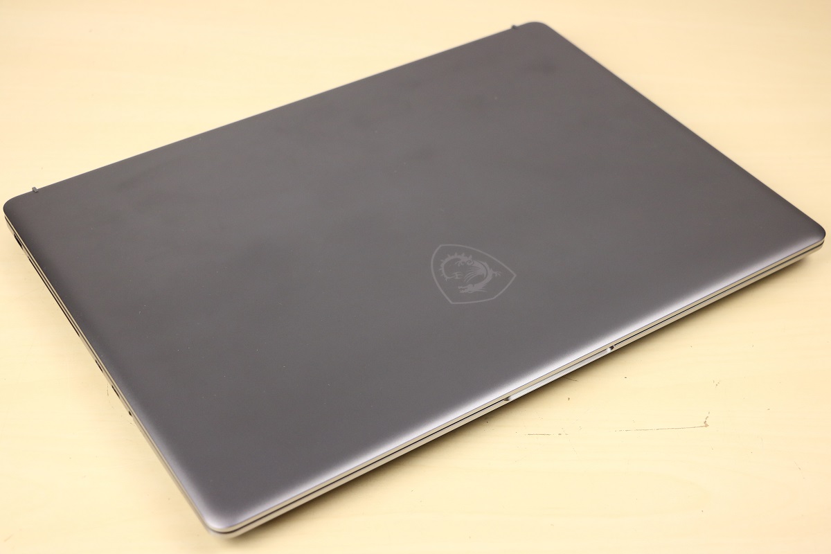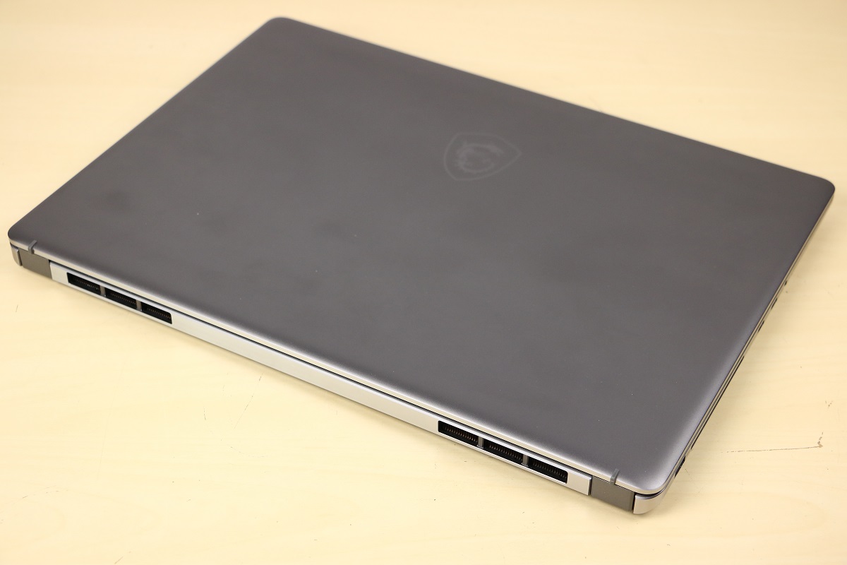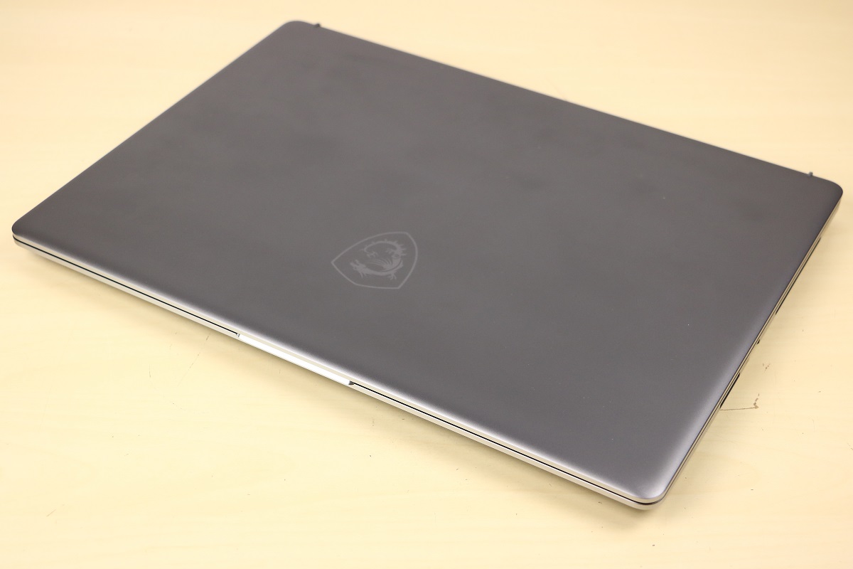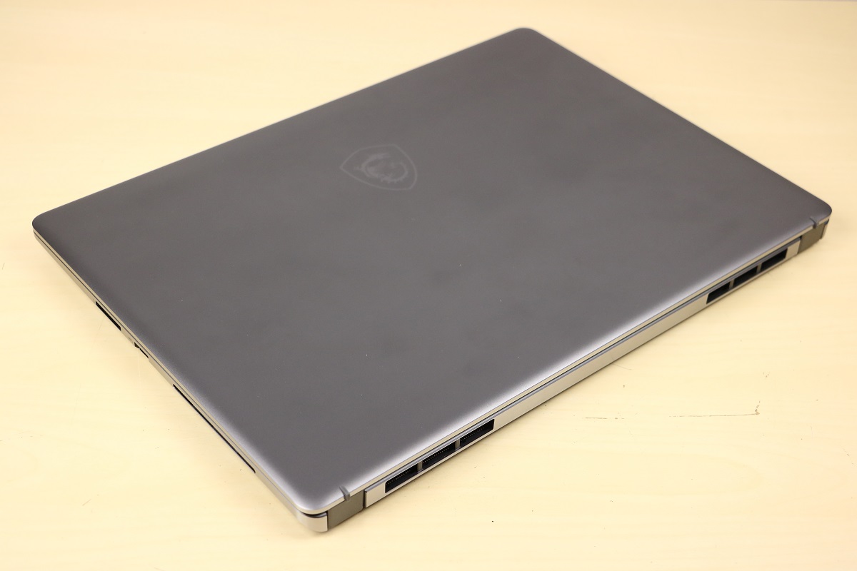 Kijken we naar de laptop zelf dan zien we dat er gebruik gemaakt is van hoogwaardige materialen. De bovenkant is gemaakt van aluminium en ziet er strak maar stijlvol uit. Het is lekker ingetogen en in tegenstelling tot een raider niet schreeuwerig. Op de klep zien we een MSI logo zitten want het moet wel duidelijk zijn van wel merk de laptop is. Deze is echter niet verlicht. Als we dan een rondje om de laptop heen doen dan zien we aan de achterkant openingen zitten waar warme lucht van de laptop naar buiten wordt geblazen. Dit is belangrijk om de laptop koel te houden zodat deze zijn prestaties langer vast kan houden. Aan de linkerkant zien we nog meer openingen zitten voor koeling, de laadpoort voor de adapter, een Thunderbolt 4 aansluiting, een USB Type-C connector en een audiopoort. Ook zit hier een lampje die laat zien dat de laptop ook aan het laden is. Aan de voorkant zit alleen een inkeping om de klep makkelijk om te klappen. Aan de rechterkant ten slotte treffen we een kaartlezer aan, een USB Type-A poort en meer koelopeningen.