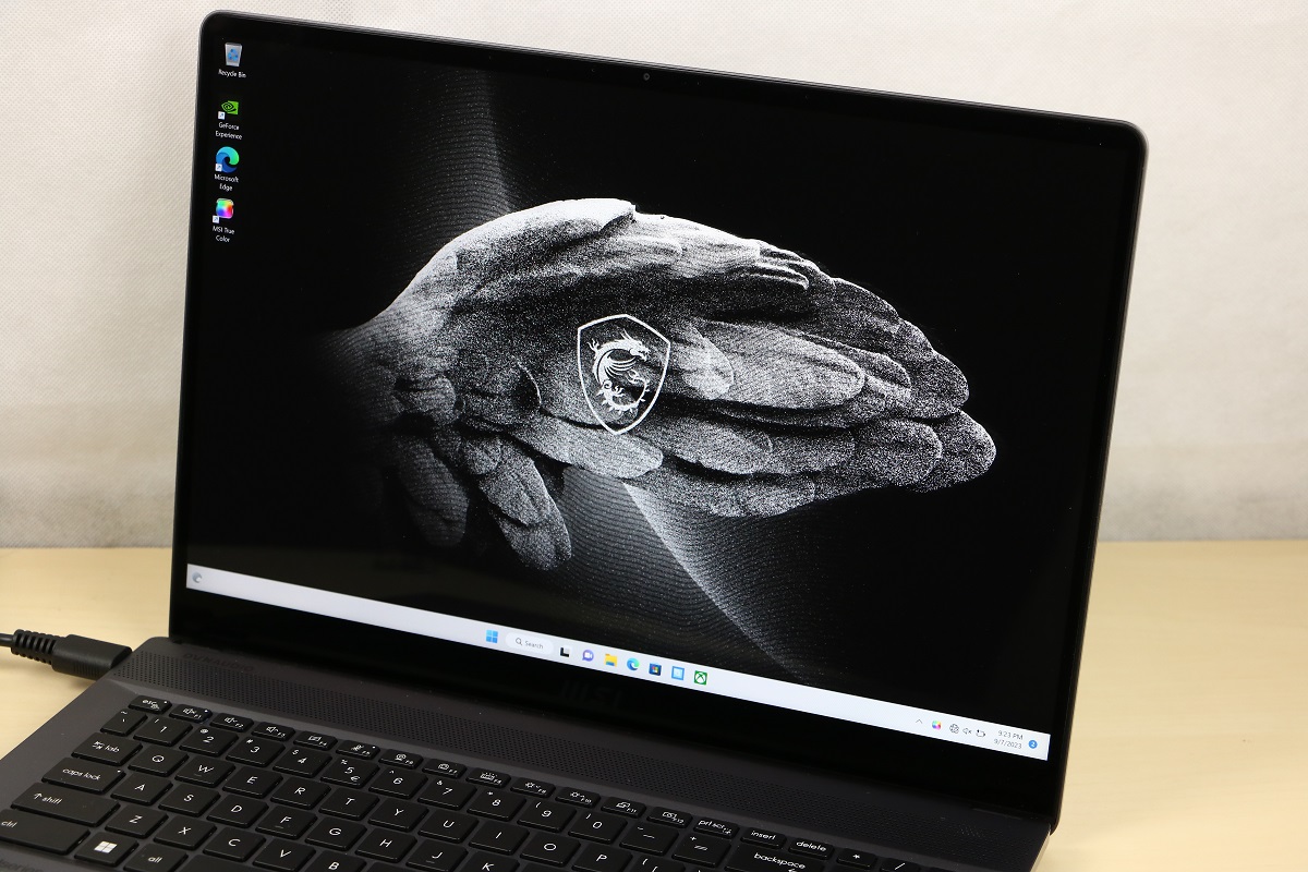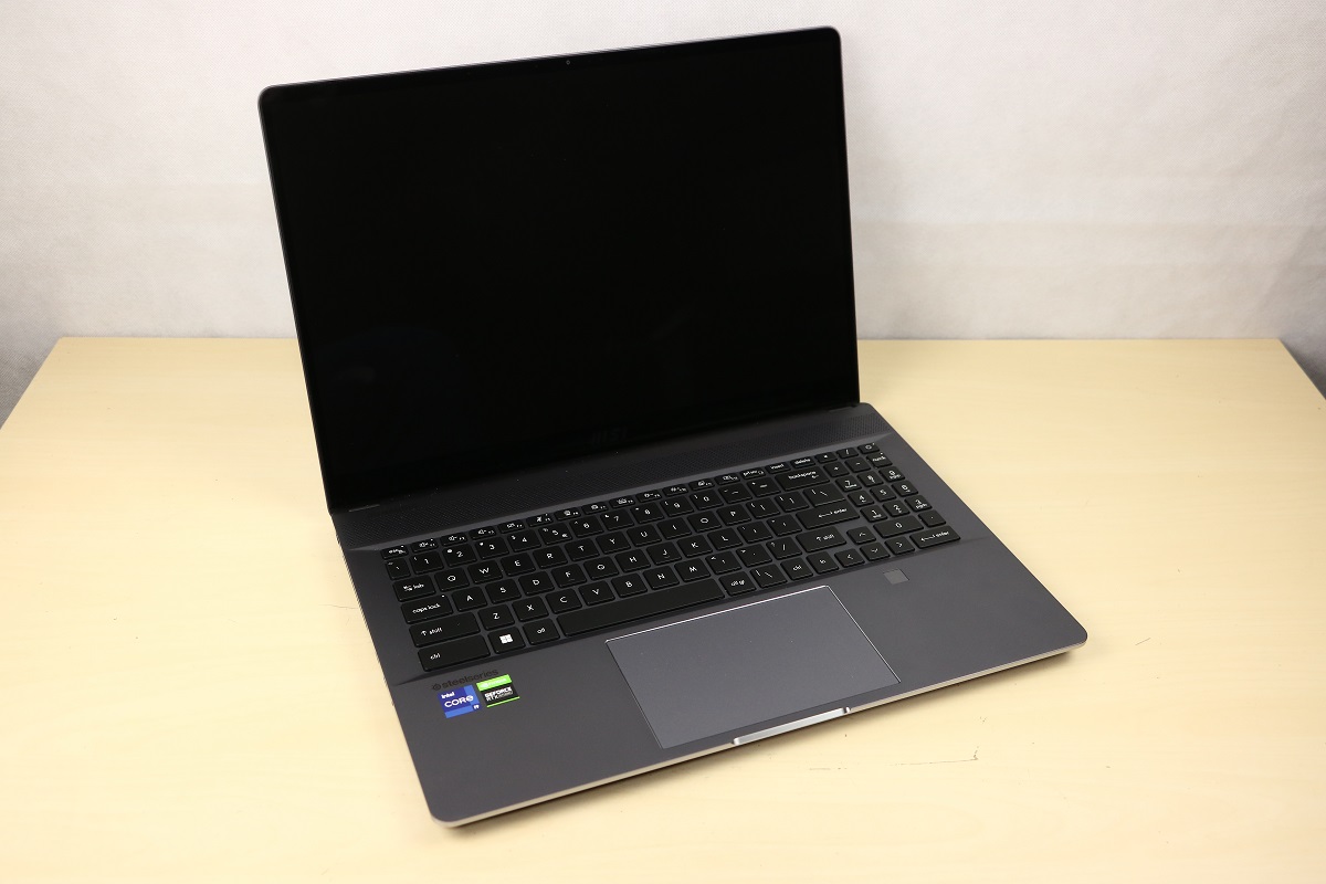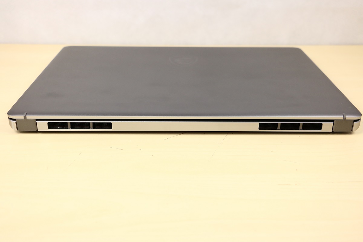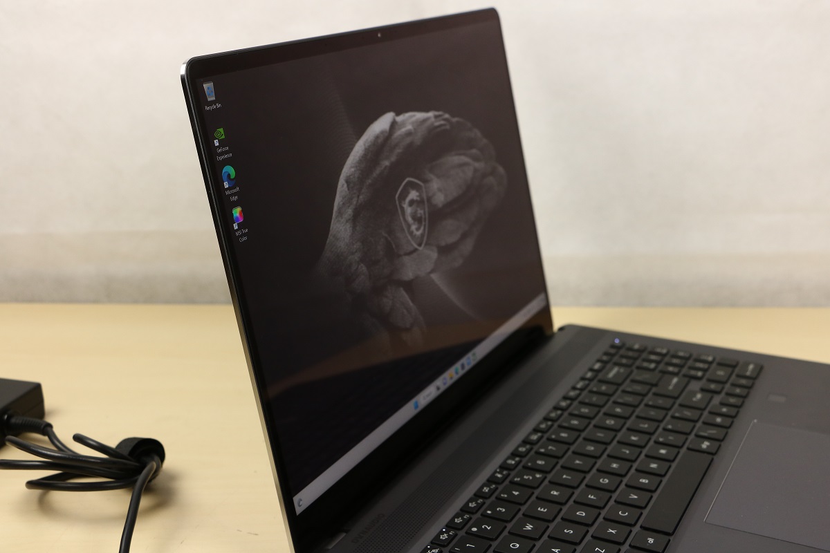 Kijken we naar de laptop zelf dan zien we dat er gebruik gemaakt is van hoogwaardige materialen. De bovenkant is gemaakt van aluminium en ziet er strak maar stijlvol uit. Het is lekker ingetogen en in tegenstelling tot een raider niet schreeuwerig. Op de klep zien we een MSI logo zitten want het moet wel duidelijk zijn van wel merk de laptop is. Deze is echter niet verlicht. Als we dan een rondje om de laptop heen doen dan zien we aan de achterkant openingen zitten waar warme lucht van de laptop naar buiten wordt geblazen. Dit is belangrijk om de laptop koel te houden zodat deze zijn prestaties langer vast kan houden. Aan de linkerkant zien we nog meer openingen zitten voor koeling, de laadpoort voor de adapter, een Thunderbolt 4 aansluiting, een USB Type-C connector en een audiopoort. Ook zit hier een lampje die laat zien dat de laptop ook aan het laden is. Aan de voorkant zit alleen een inkeping om de klep makkelijk om te klappen. Aan de rechterkant ten slotte treffen we een kaartlezer aan, een USB Type-A poort en meer koelopeningen.