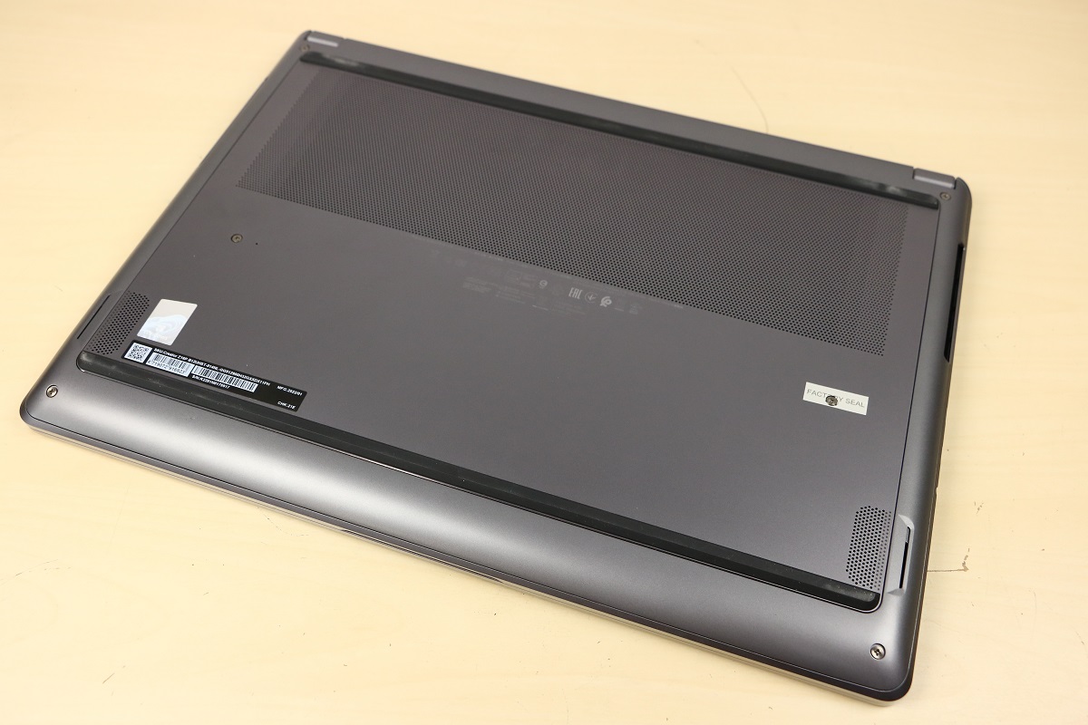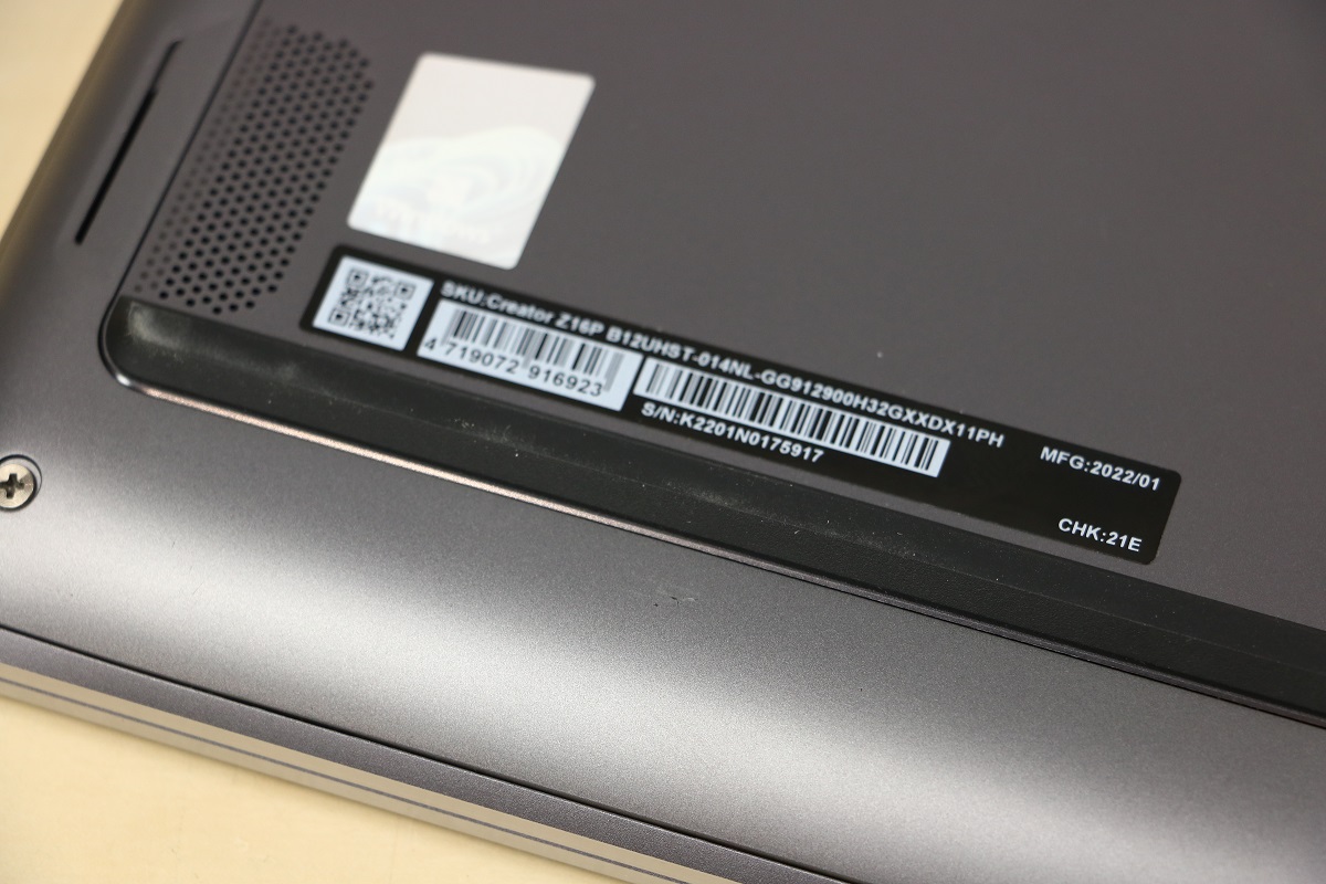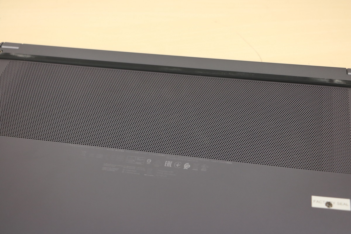 Dan kijken we als laatste nog naar de onderkant. Aan de boven- en onderkant zien we een rubber strip zitten die moet voorkomen dat de laptop gaat verschuiven tijdens het gebruik. Linksonder zien we een sticker zitten met de SKU (oftewel de naam met het typenummer), het serienummer en een QR code. Ook zit er een sticker van Microsoft Windows geplakt. Links en rechts zitten twee speakers die voor het geluid vanuit de laptop moeten zorgen. Het zijn niet de grootste speakers maar dat maakt in dit geval niet uit. Het belangrijkste is dat er geluid uit komt. Aan de bovenkant zien we enorm veel gaatjes zitten die ook moeten zorgen voor extra koeling. Zo kan de laptop langer zijn volle potentie laten zien voordat hij zichzelf iets terug klokt vanwege de warmte.