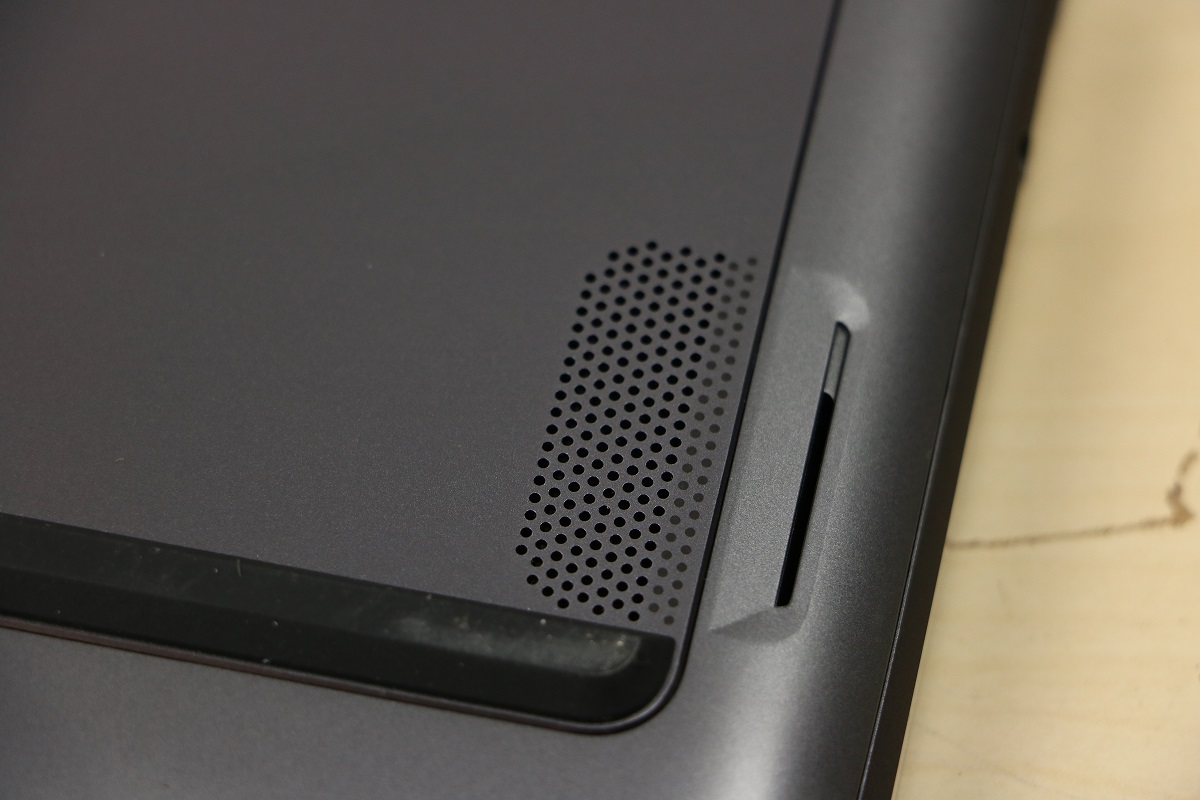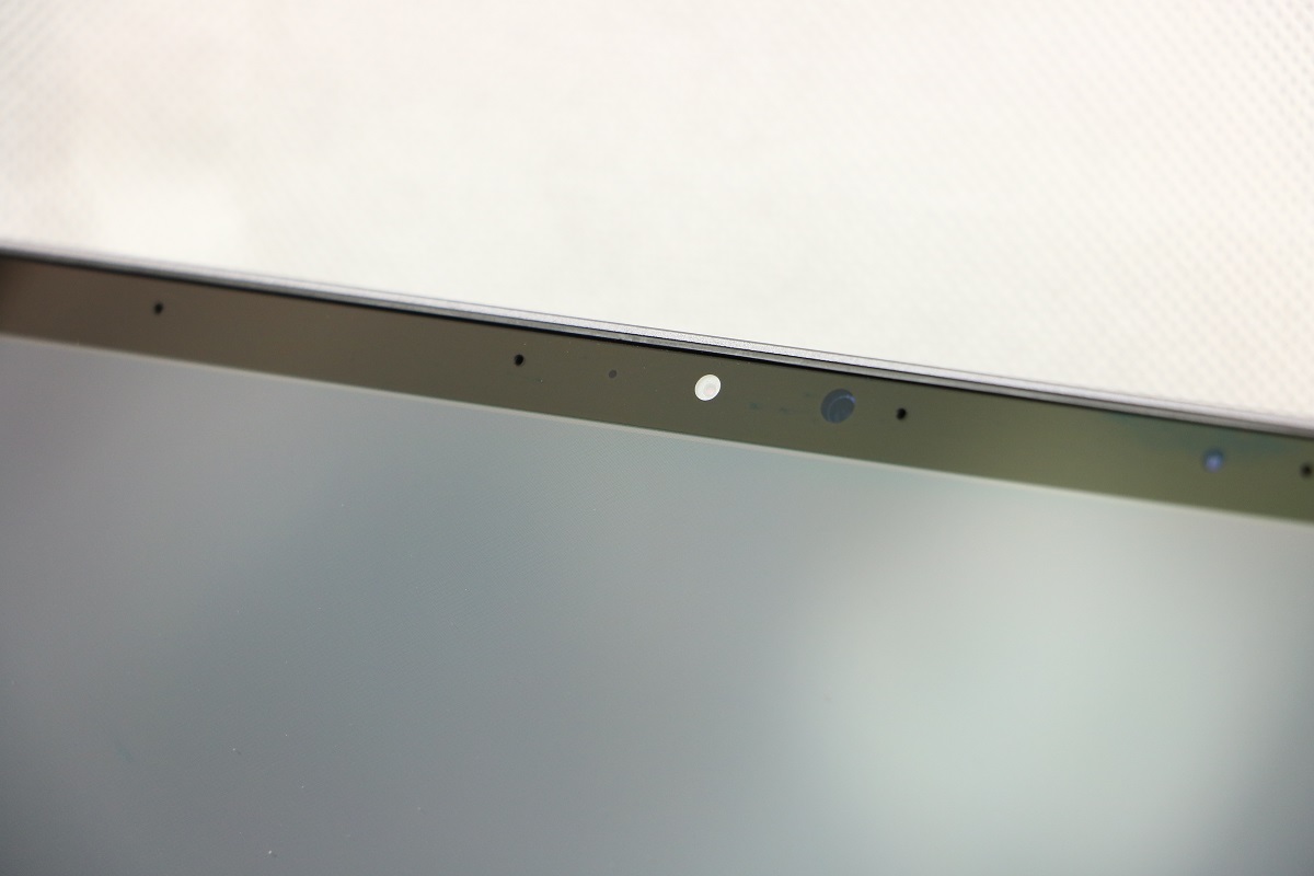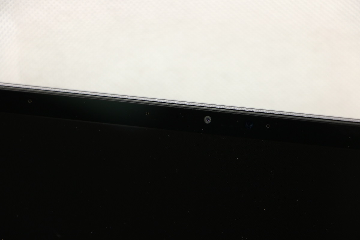 Als we naar de bovenkant van het scherm kijken dan zien we daar in eerste instantie alleen de camera zitten. Zetten we wat meer licht op het scherm dan komen daar wat meer zaken tevoorschijn. Dit zijn een aantal sensoren die verschillende taken hebben. Denk aan een lichtsensor die automatisch de helderheid kan aanpassen om maar iets te noemen. Onder het scherm zitten nog ventilatiegaten om de laptop van extra koeling te voorzien. Deze kan namelijk best warm worden als hij flink aan de slag moet. Iets wat we eerder niet hebben gezien is een rubber randje op de klep van de laptop. Deze kan ervoor zorgen dat het scherm zonder problemen naar achteren geklapt kan worden. Klap je het scherm niet helemaal naar achteren dan is er niets aan de hand. Doe je dit wel dan zorgt het rubber ervoor dat de behuizing niet gaat krassen. Wel zorgt dit ervoor dat de laptop iets van de tafel geduwd wordt. Dit is op zich niet zo erg: zo is er iets meer koeling plus kan het typen voor sommige mensen wat fijner aanvoelen.