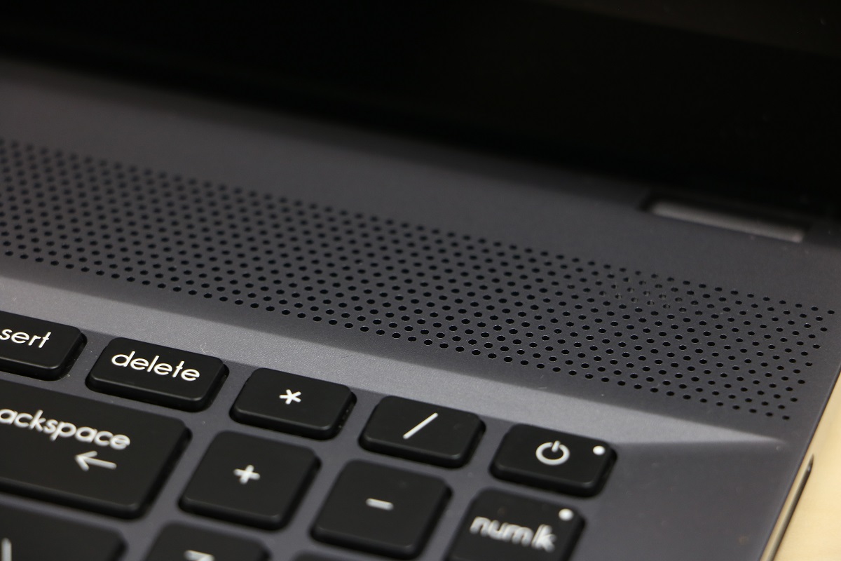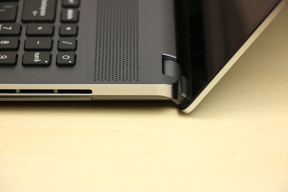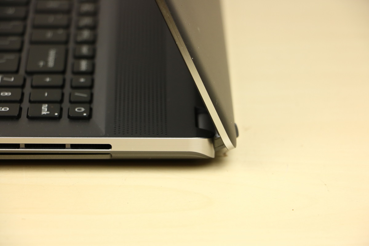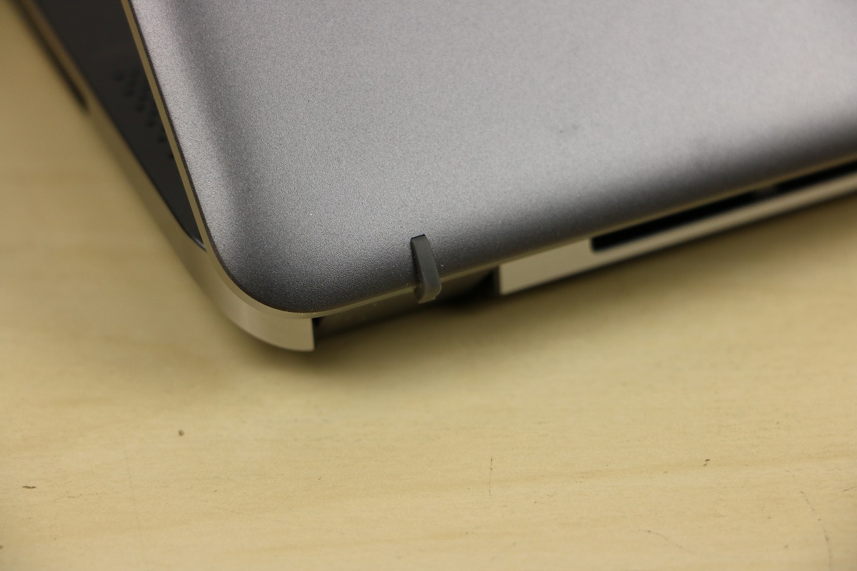 Als we naar de bovenkant van het scherm kijken dan zien we daar in eerste instantie alleen de camera zitten. Zetten we wat meer licht op het scherm dan komen daar wat meer zaken tevoorschijn. Dit zijn een aantal sensoren die verschillende taken hebben. Denk aan een lichtsensor die automatisch de helderheid kan aanpassen om maar iets te noemen. Onder het scherm zitten nog ventilatiegaten om de laptop van extra koeling te voorzien. Deze kan namelijk best warm worden als hij flink aan de slag moet. Iets wat we eerder niet hebben gezien is een rubber randje op de klep van de laptop. Deze kan ervoor zorgen dat het scherm zonder problemen naar achteren geklapt kan worden. Klap je het scherm niet helemaal naar achteren dan is er niets aan de hand. Doe je dit wel dan zorgt het rubber ervoor dat de behuizing niet gaat krassen. Wel zorgt dit ervoor dat de laptop iets van de tafel geduwd wordt. Dit is op zich niet zo erg: zo is er iets meer koeling plus kan het typen voor sommige mensen wat fijner aanvoelen.