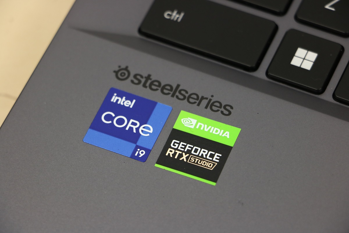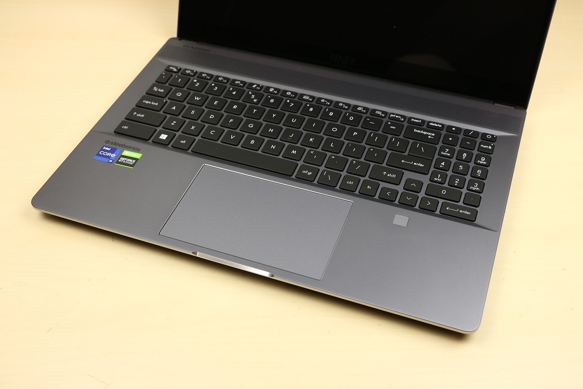 Als eerste zien we in het scherm de merknaam terug. Dit is het zakelijke logo van MSI en dus niet het Gaming logo. Verder hebben we linksonder twee stickers zitten. De eerste sticker laat zien dat de laptop voorzien is van een Intel Core i9 processor, terwijl de tweede sticker aangeeft dat de Creator voorzien is van een NVIDIA videokaart en gebruik maakt van de Studio drivers. Deze drivers zijn gericht op productiviteit en niet zo zeer op Gaming. Daarboven staat het logo van Steelseries, de fabrikant die verantwoordelijk is voor het toetsenbord. Rechts onderin zien we een fingerprint reader waarmee de biometrische beveiliging geactiveerd kan worden. Denk aan het ontgrendelen van Windows of het geven van toestemming bij 2-factor authenticatie. Als laatste zien we links bovenin de naam Dynaudio. Deze partij heeft het geluid van de laptop verzorgt.