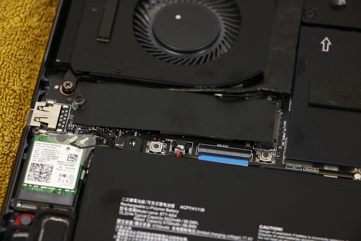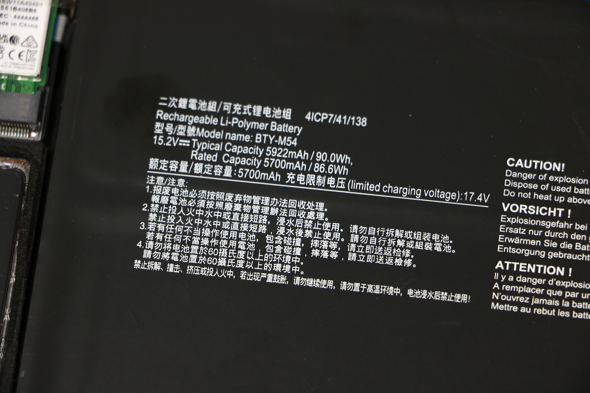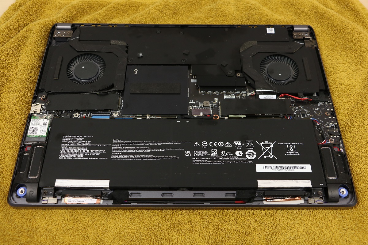 Maken we tenslotte de laptop vanaf de onderkant nog open. Om dit te doen moeten er zes schroefjes losgemaakt worden. Daarna kan de hele plaat losgehaald worden waarna de diverse componenten te zien zijn. Er is een schroef afgedekt met een sticker maar in Nederland mag de laptop gewoon open gemaakt worden. Dit is ook nodig als er een SSD bijgeplaatst wordt of het geheugen gewisseld wordt voor meer geheugen. Is hij open dan vallen in eerste instantie de twee ventilatoren op die zich bovenin bevinden. Deze moeten zorgen dat de warmte van de heatpipes weggeblazen worden, zowel naar de bovenkant als de zijkanten. Daaronder hebben we twee locaties waar een M.2 SSD thuis hoort. Er is al één slot bezet, het tweede slot is leeg en beschikbaar voor een nieuw exemplaar. Beiden zijn voorzien van een zwart plaatje wat moet zorgen voor iets van koeling. Naast het linker slot zit een kapje die het geheugen verborgen houdt. Halen we dit los (het zit met tape vast) dan zitten daar twee modules van ieder 16GB. Dit geeft in totaal 32GB aan werkgeheugen wat voldoende moet zijn. Helemaal onderin zit de accu van 90Wh en een capaciteit van 5700mAh waarmee je toch een tijdje moet kunnen werken. Hoe lang dat is hangt ook af van de applicaties die gebruikt worden. We komen daar later op terug. Als laatste zien we de Wifi kaart zitten die moet zorgen dat het internet overal te gebruiken is terwijl er geen kabel nodig is.