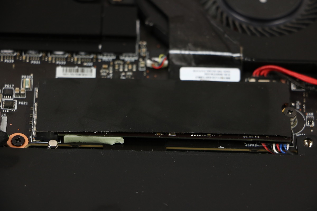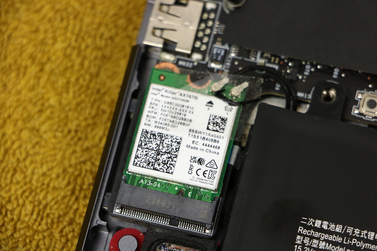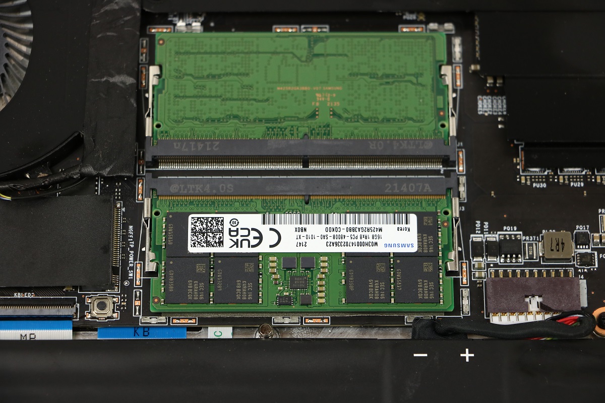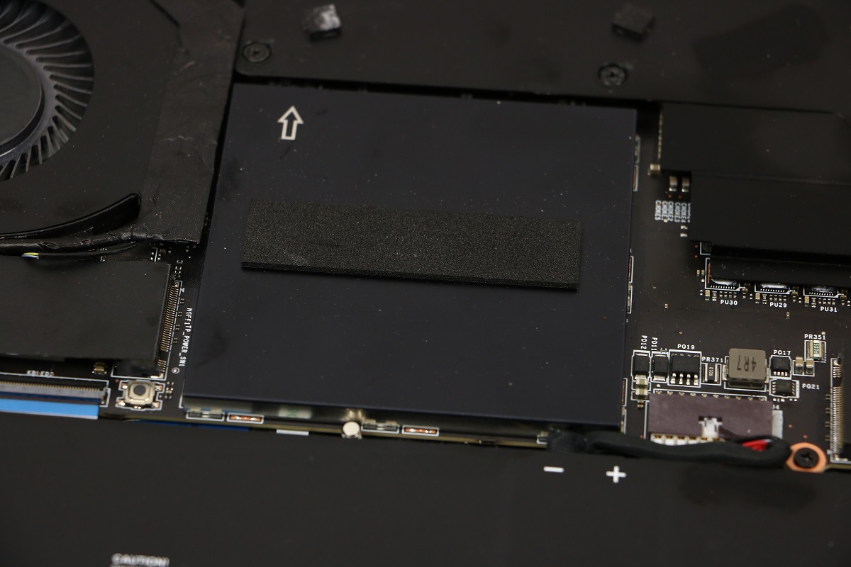 Maken we tenslotte de laptop vanaf de onderkant nog open. Om dit te doen moeten er zes schroefjes losgemaakt worden. Daarna kan de hele plaat losgehaald worden waarna de diverse componenten te zien zijn. Er is een schroef afgedekt met een sticker maar in Nederland mag de laptop gewoon open gemaakt worden. Dit is ook nodig als er een SSD bijgeplaatst wordt of het geheugen gewisseld wordt voor meer geheugen. Is hij open dan vallen in eerste instantie de twee ventilatoren op die zich bovenin bevinden. Deze moeten zorgen dat de warmte van de heatpipes weggeblazen worden, zowel naar de bovenkant als de zijkanten. Daaronder hebben we twee locaties waar een M.2 SSD thuis hoort. Er is al één slot bezet, het tweede slot is leeg en beschikbaar voor een nieuw exemplaar. Beiden zijn voorzien van een zwart plaatje wat moet zorgen voor iets van koeling. Naast het linker slot zit een kapje die het geheugen verborgen houdt. Halen we dit los (het zit met tape vast) dan zitten daar twee modules van ieder 16GB. Dit geeft in totaal 32GB aan werkgeheugen wat voldoende moet zijn. Helemaal onderin zit de accu van 90Wh en een capaciteit van 5700mAh waarmee je toch een tijdje moet kunnen werken. Hoe lang dat is hangt ook af van de applicaties die gebruikt worden. We komen daar later op terug. Als laatste zien we de Wifi kaart zitten die moet zorgen dat het internet overal te gebruiken is terwijl er geen kabel nodig is.