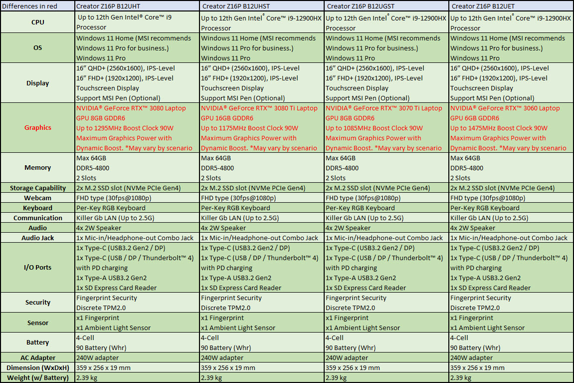 Van deze laptop zijn er vier verschillende versies uitgebracht. Het enige verschil tussen de vier modellen is de videokaart. In het goedkoopste model zit een 3060 terwijl er in onze sample een 3080Ti verwerkt is. De rest is allemaal hetzelfde wat in houdt dat de laptop uitgerust kan worden met maximaal een Core i9 uit de 12e generatie. Daarnaast kan er tot maximaal 64GB aan geheugen in geplaatst worden. Er wordt normaal gesproken 32GB aan geheugen geleverd maar het dubbele is dus mogelijk. Het scherm is ook voor alle machines hetzelfde en dus ook de maximale resolutie. Dit is niet 1440p zoals je zou denken maar 2560 x 1600. Dit levert een 16:10 verhouding wat beter is voor het bewerken van video's of andere content. Alle laptops krijgen dezelfde adapter mee namelijk een 240 Watt exemplaar. Bedenk wel: hoe sneller de processor, hoe sneller de accu leeg raakt.