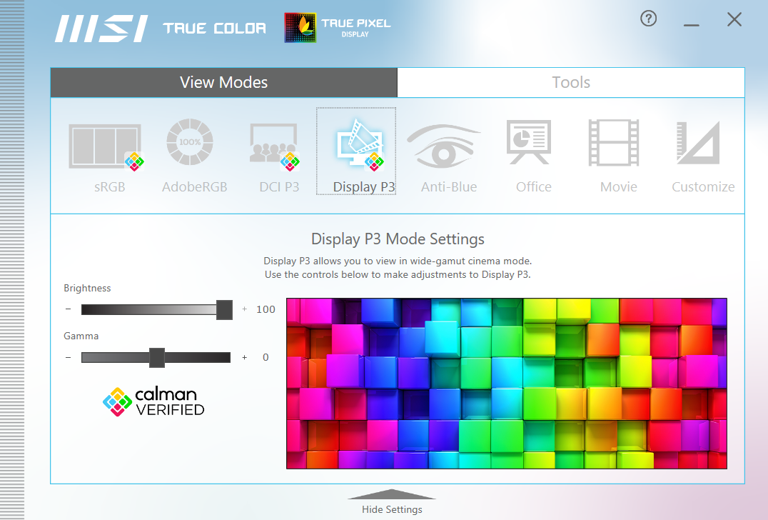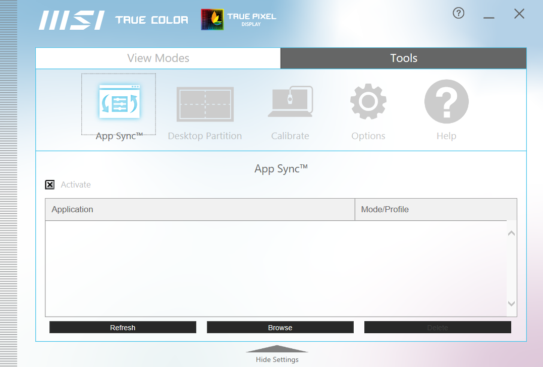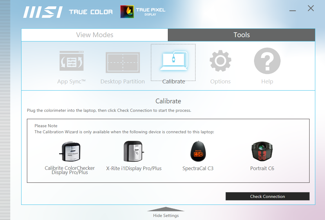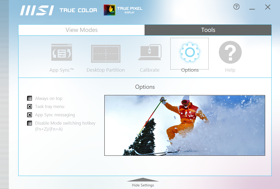 Het eerste programma waar we naar kijken en wat al geïnstalleerd is, is MSI True Color. Deze tool moet ervoor zorgen dat elke pixel precies dat laat zien wat het echt moet zijn. Elk paneel wordt vanuit de fabriek al gekalibreerd. Alleen de panelen die de grondige tests doorstaan of nog met een kleine aanpassing te redden zijn worden gebruikt. Met de software is het mogelijk om een kleurprofiel te activeren wat jij wilt hebben. Er zijn verschillende profielen ingesteld, variërend van sRGB, AdobeRGB tot Office en Movie. Ook is het mogelijk om het blauwe licht te filteren waardoor je niet constant wakker gehouden wordt. Maar het is ook mogelijk om een eigen profiel samen te stellen. In Tools hebben we nog een paar verschillende opties. Met App Sync kunnen profielen ingesteld worden op verschillende applicaties. Wanneer je Photoshop start wil je wellicht een ander profiel dan wanneer je een film kijkt via VLC. Zo start precies dat profiel wat jij wilt hebben in een programma. Het volgende tabblad, Calibrate, maakt het mogelijk om het scherm opnieuw te calibreren. Hiervoor moet je wel het juiste apparaat hebben anders gaat het programma niet werken. Gelukkig zijn er ook andere programma's te krijgen. Als laatste hebben we Options waar we een aantal vinkjes aan of uit kunnen zetten.