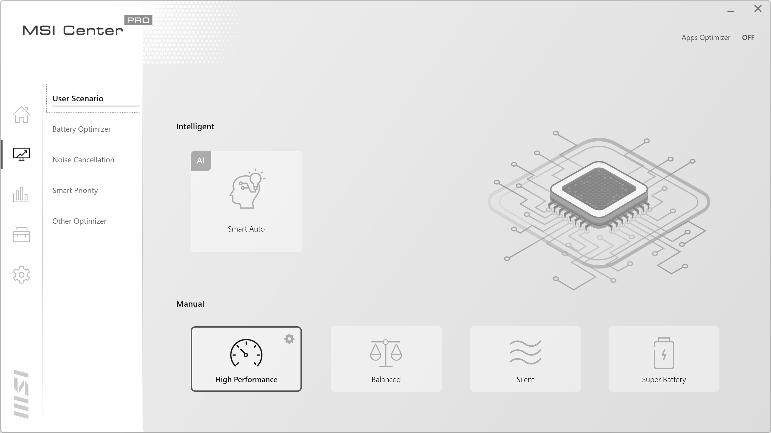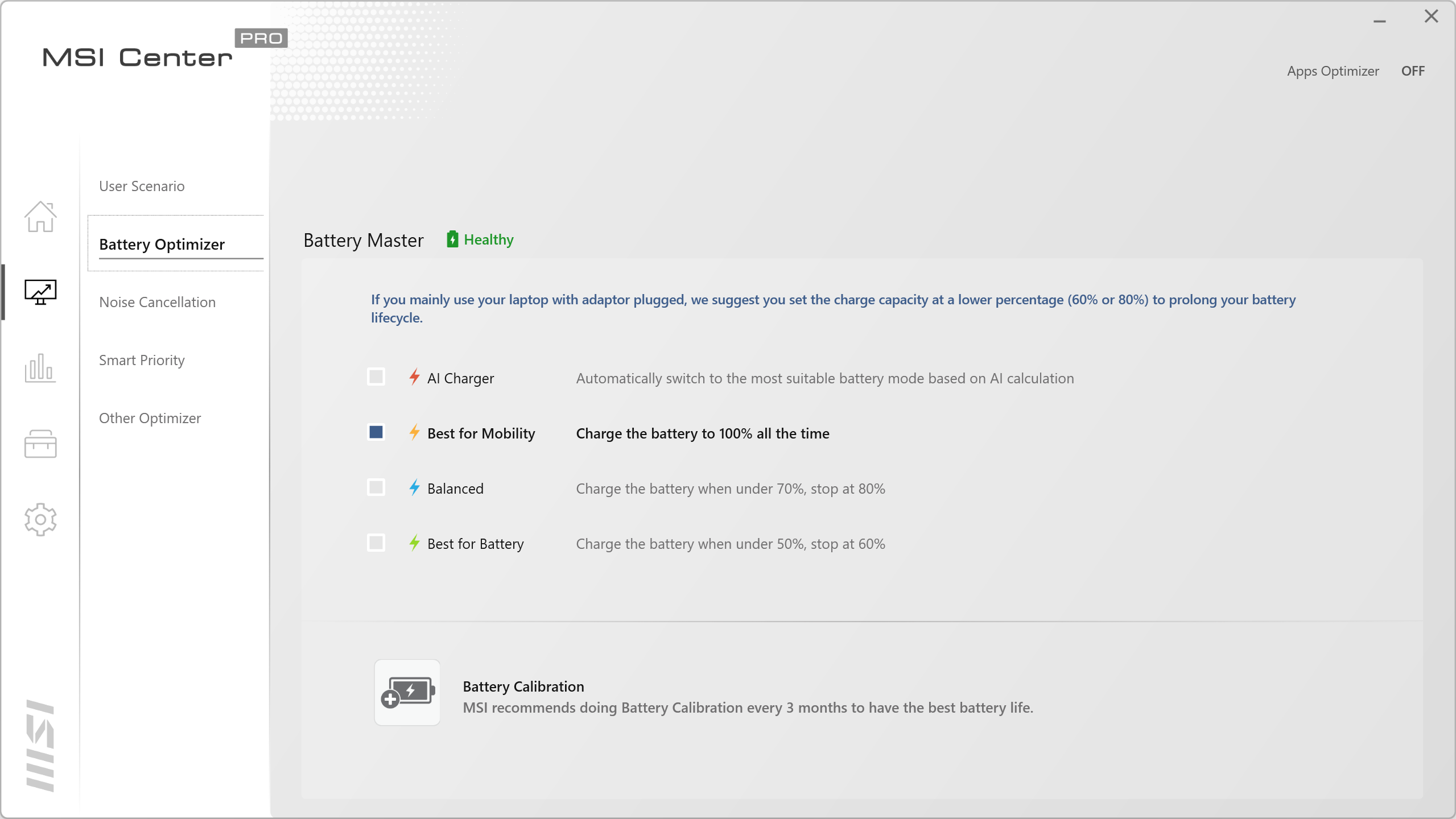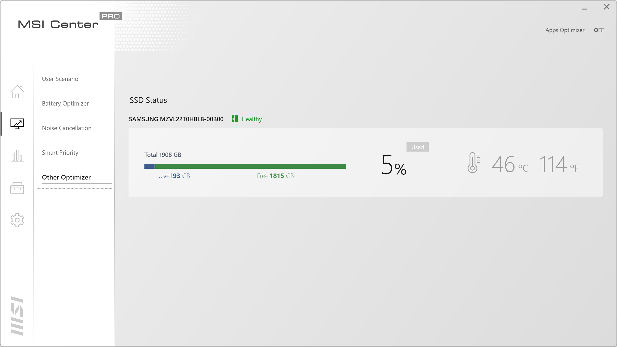 Het volgende item is de Apps Optimizer. Zo is het mogelijk om de verschillende apps te optimaliseren voor jouw laptop. Zo kan er standaard gekozen worden of de laptop op High Performance moet staan, gebalanceerd of juist op stil. De verschillende scenario's hebben natuurlijk effect op de batterijduur van de laptop. Als deze op High Performance staat zal de accu van de laptop sneller leeg lopen dan wanneer deze op Silent staat. De batterij kan ook geoptimaliseerd worden. Er kan gekozen worden wanneer de batterij opgeladen moet worden en wanneer het laden moet stoppen. Dit alles om zo lang mogelijk gebruik te kunnen maken van de accu. De volgende optie wordt gebruikt om de noise cancellation van de speakers en de microfoon aan te zetten of juist niet. Op die manier wordt het achtergrondgeluid weggefilterd of juist toegelaten. Bij Smart Priority bepaalt de laptop zelf waar de prioriteit aan gegeven wordt. Standaard staat deze optie overigens uit. Het laatste is de SSD status. Hier kan niets in aangepast worden.