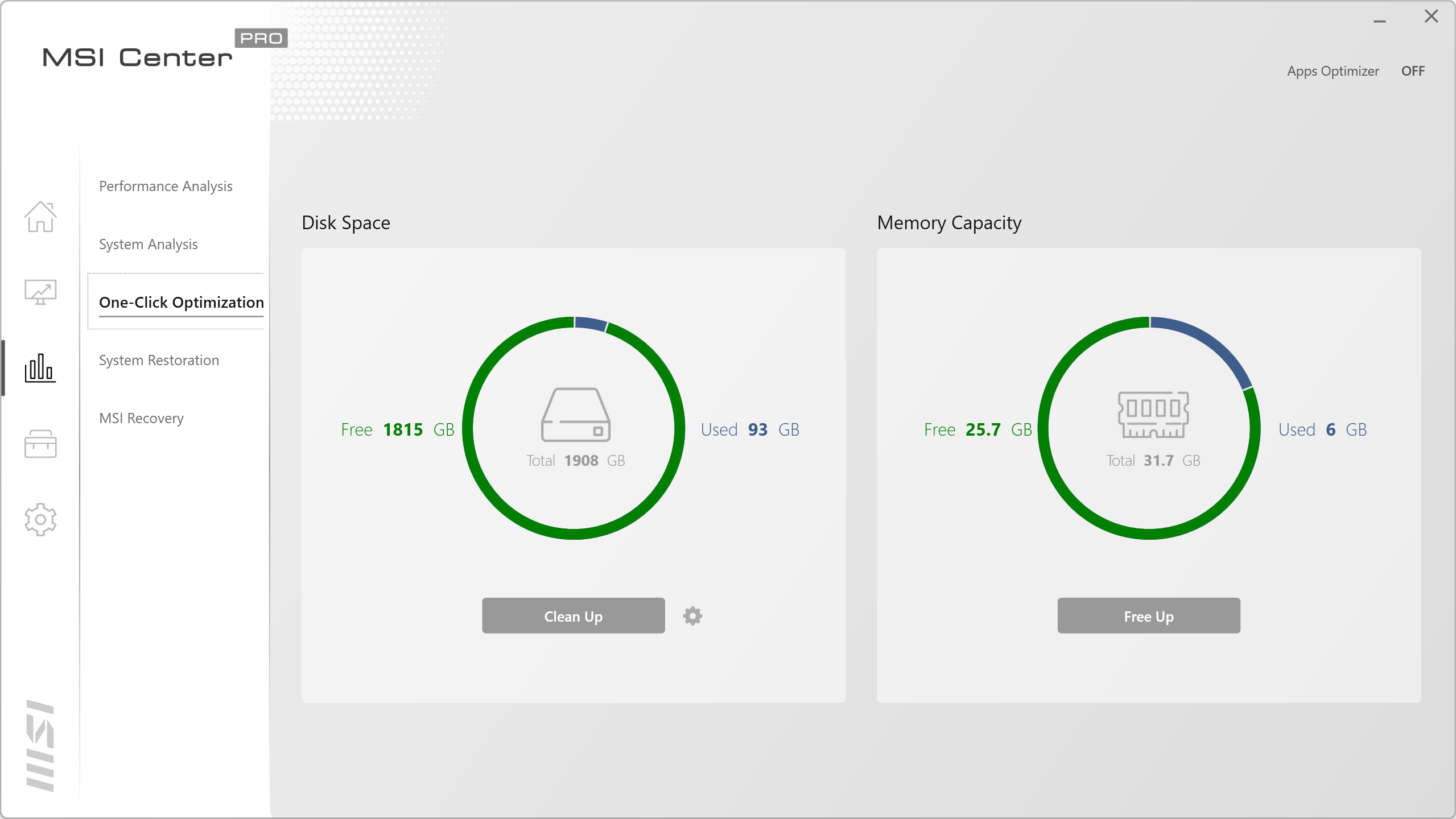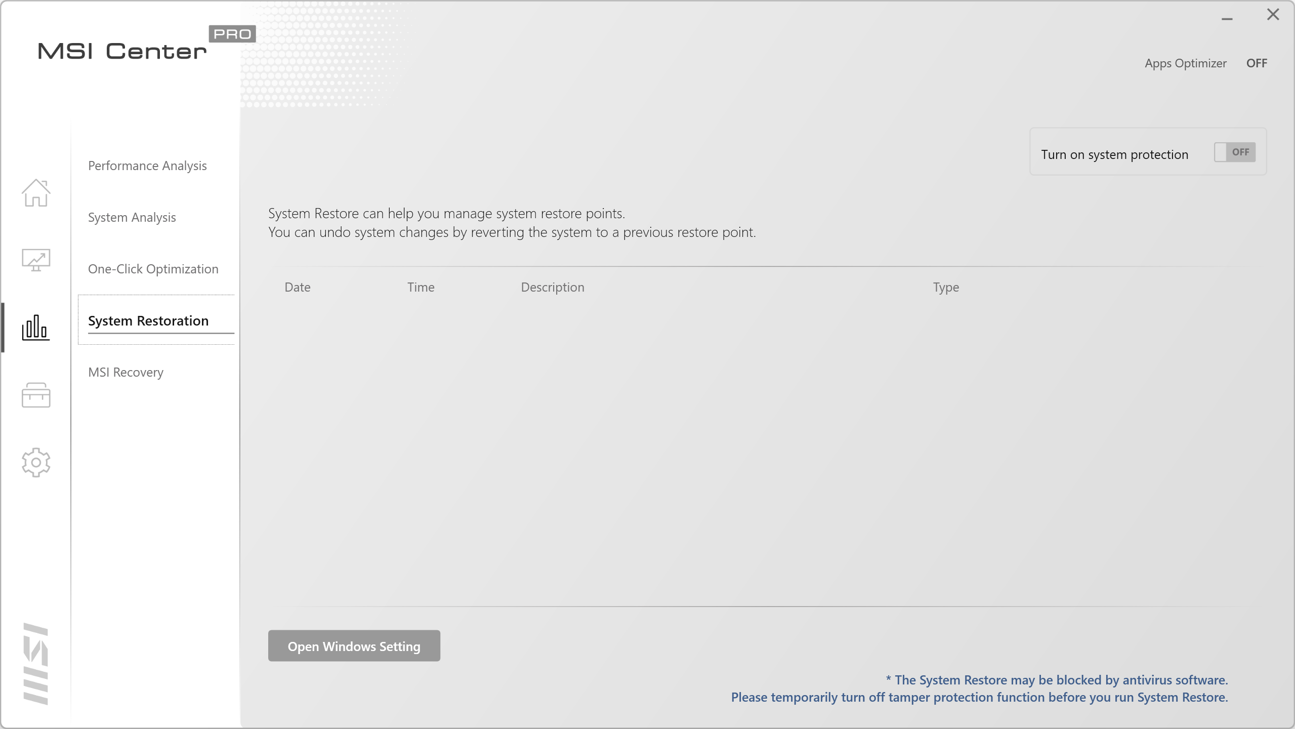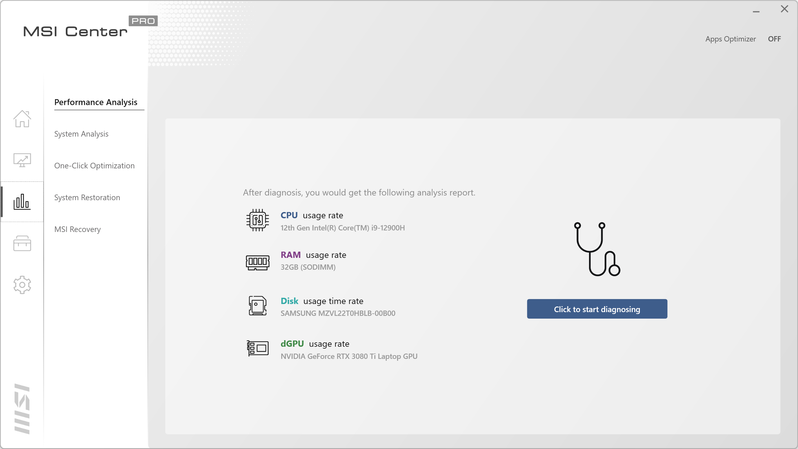 Het volgende item kan verschillende onderdelen van het systeem analyseren en zo nodig problemen herstellen. Bij Performance Analysis wordt er een complete diagnose gedaan op de machine om te zien wat het verbruik is van de verschillende onderdelen van de laptop. Bij System Analysis wordt het systeem nagekeken. Bij One-Click Optimization kan het geheugen geleegd worden en gekeken worden wat er eventueel van de SSD weggegooid kan worden. Bij System Restoration kan het systeem teruggezet worden naar een eerdere status, mocht het besturingssysteem niet meer werken. Bij MSI recovery kunnen we nog een stap verder gaan en het systeem helemaal herstellen, mocht niets anders meer werken.