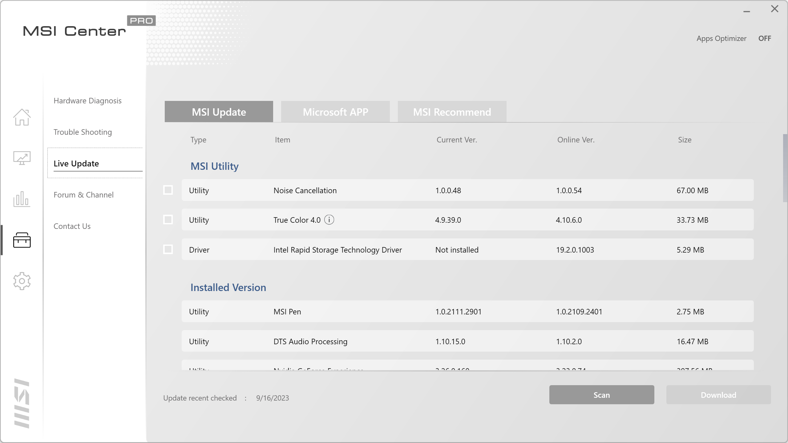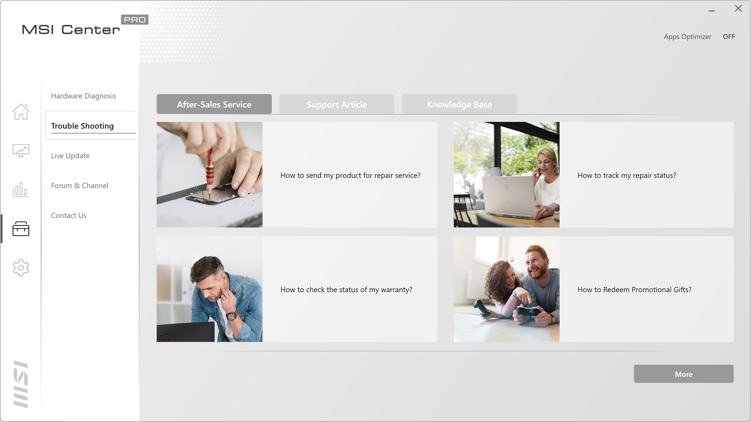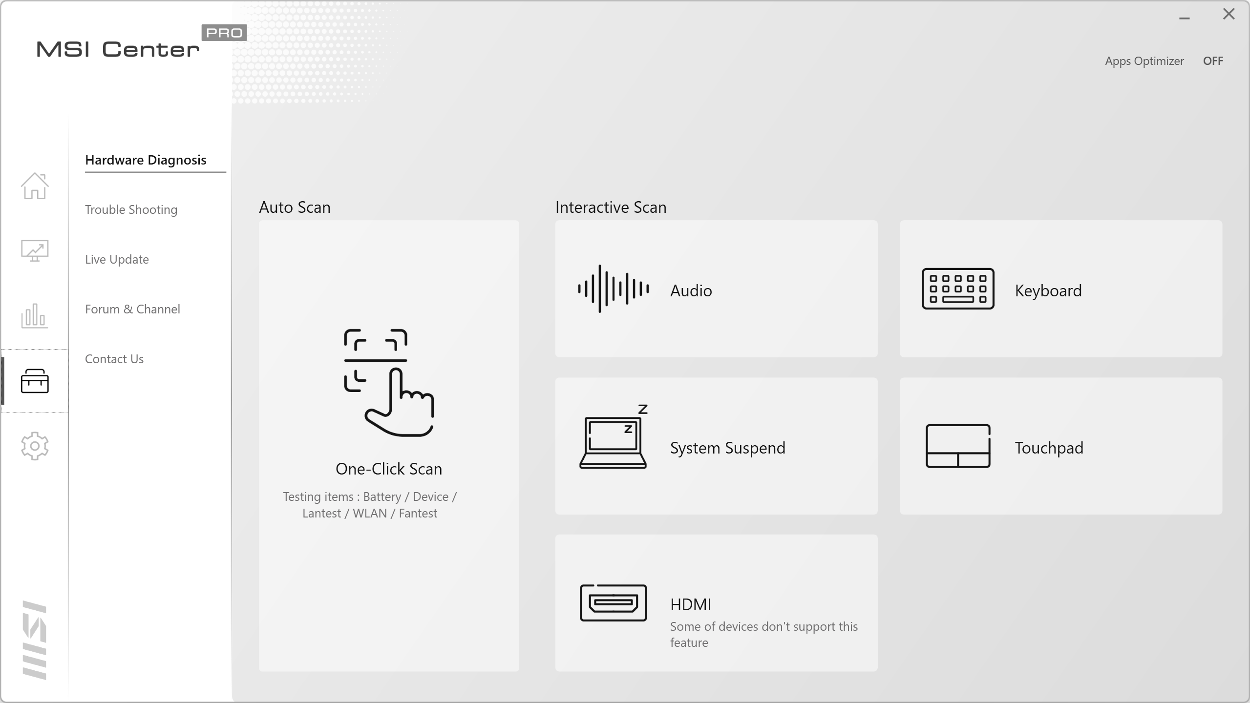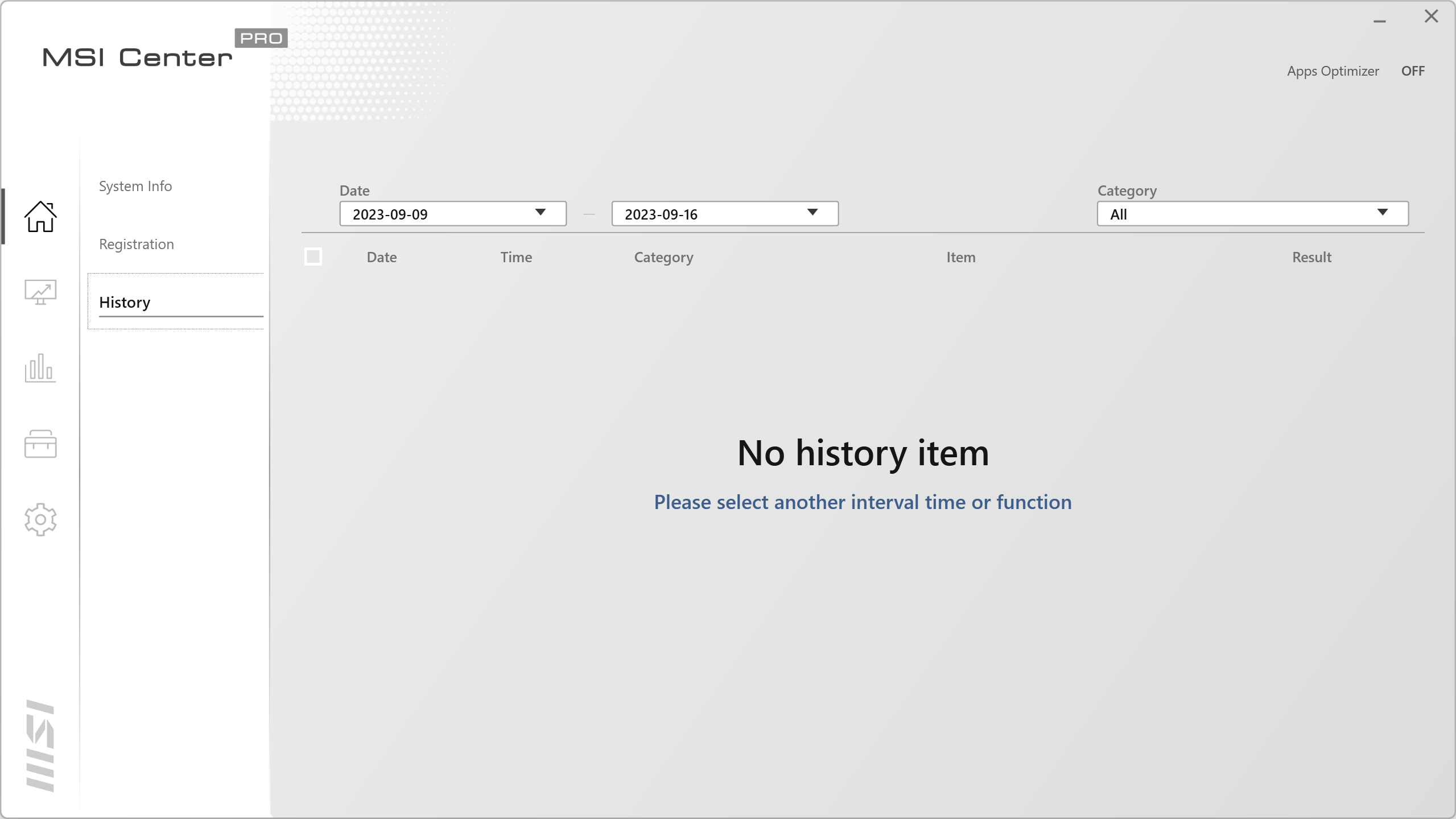 Het volgende item kan verschillende onderdelen van het systeem analyseren en zo nodig problemen herstellen. Bij Performance Analysis wordt er een complete diagnose gedaan op de machine om te zien wat het verbruik is van de verschillende onderdelen van de laptop. Bij System Analysis wordt het systeem nagekeken. Bij One-Click Optimization kan het geheugen geleegd worden en gekeken worden wat er eventueel van de SSD weggegooid kan worden. Bij System Restoration kan het systeem teruggezet worden naar een eerdere status, mocht het besturingssysteem niet meer werken. Bij MSI recovery kunnen we nog een stap verder gaan en het systeem helemaal herstellen, mocht niets anders meer werken.