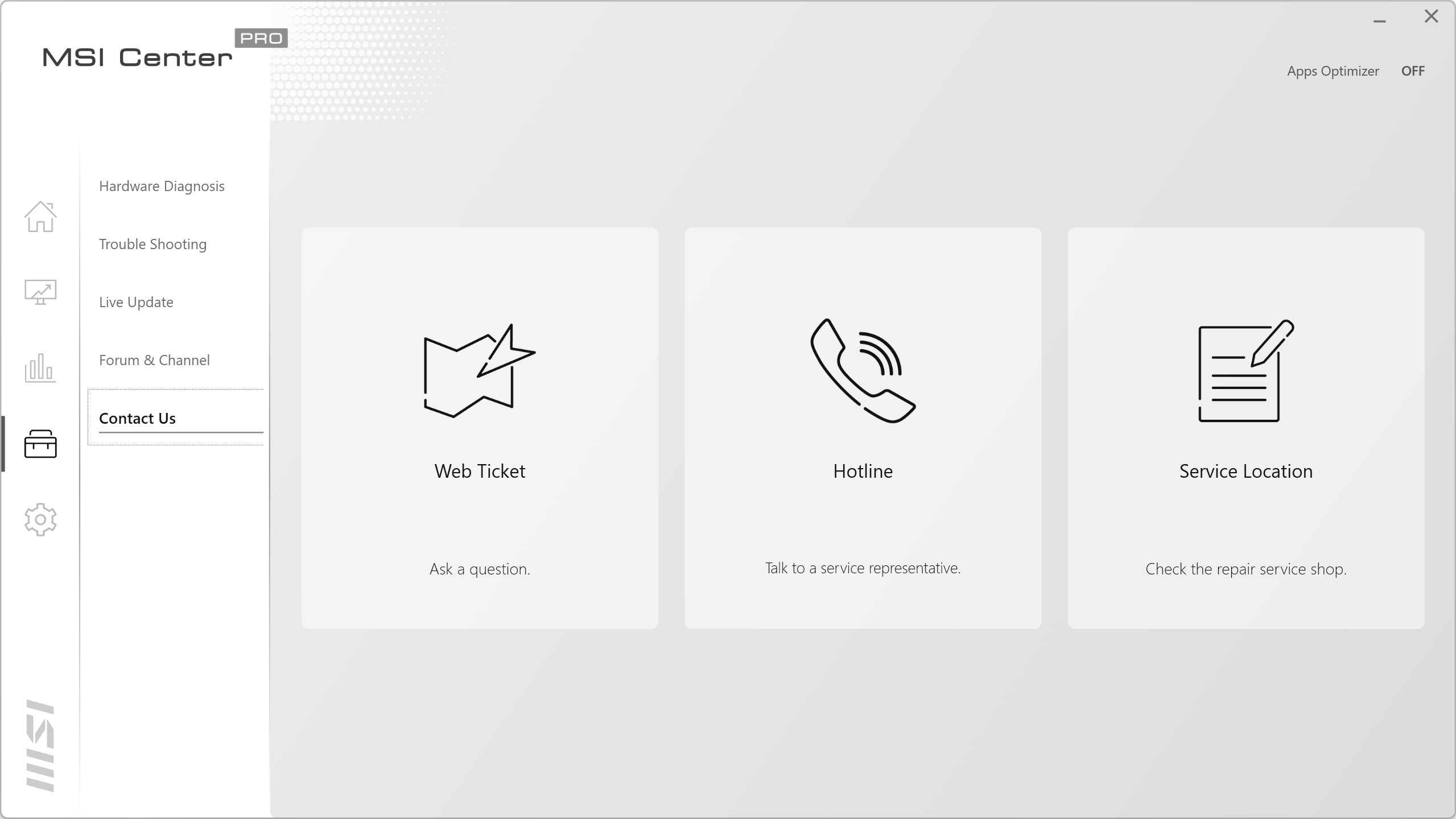 Het volgende onderdeel is de toolkit. Hier kunnen in het eerste scherm verschillende items van de laptop getest worden om te zien of er problemen zijn. Tevens is het mogelijk om een interactieve scan te doen waarbij je zelf handelingen uit dient te voeren. Trouble Shooting geeft toegang tot tot een kennis databank waar je wellicht informatie vindt om je probleem op te lossen. Bij Live Update kunnen de verschillende programma's bijgewerkt worden maar ook onderdelen van Windows worden hier genoemd. Er is tevens een Recommended tabblad waar software van derden tussen staat maar of dit wenselijk is, is maar de vraag. De laatste twee dingen zijn links naar het forum van MSI en een tabblad hoe je contact op kunt nemen met MSI: via een ticket, telefoon of waar zich een servicepunt bevindt.