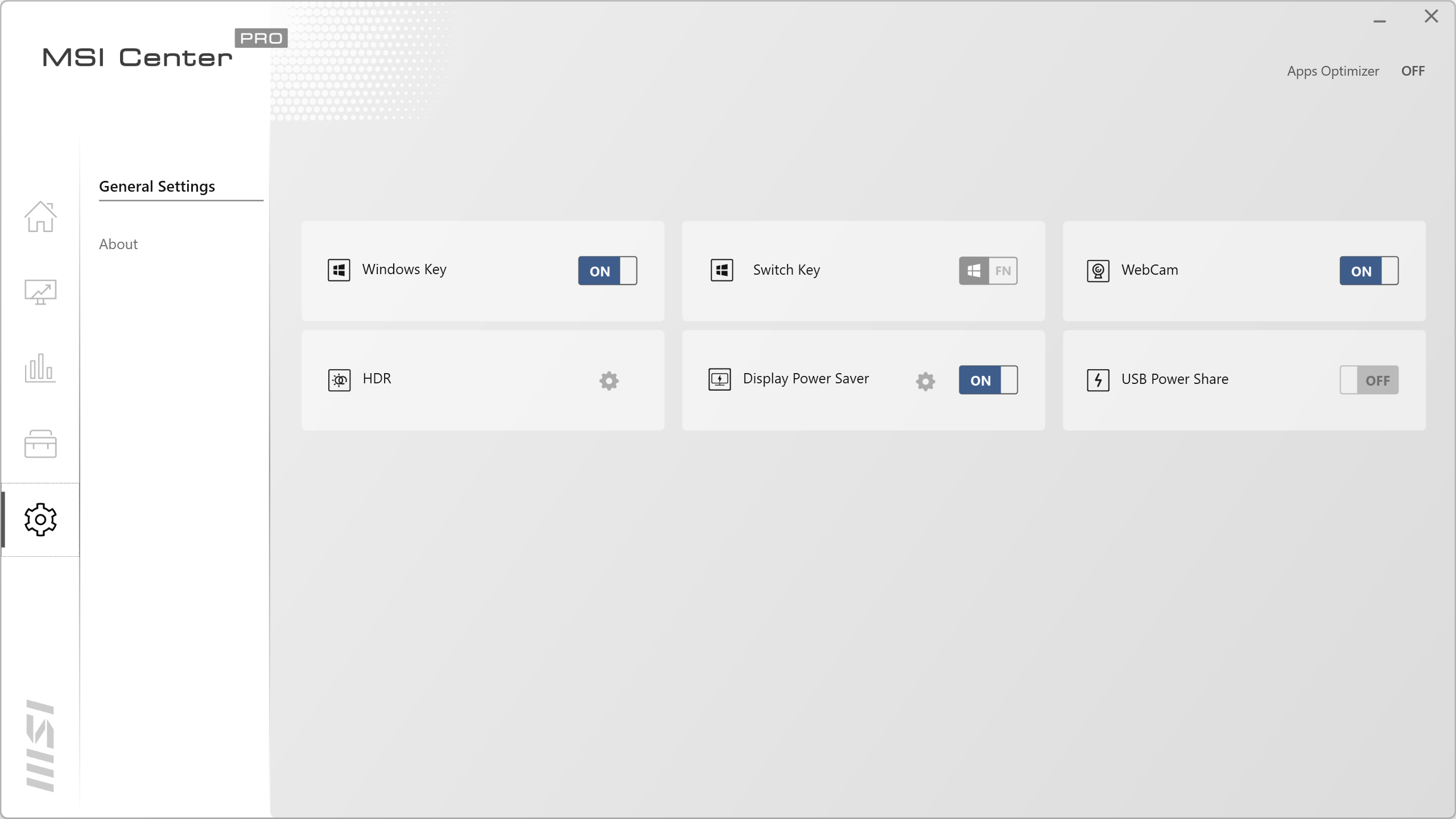Dan hebben we nog een opties scherm in de vorm van een tandwiel. Dit betreft algemene instellingen waarbij de Webcam knop actief is, de Windows key of dat HDR ingeschakeld is. Dit geldt echter niet voor elke laptop want niet elke laptop heeft zo'n display tot zijn beschikking.