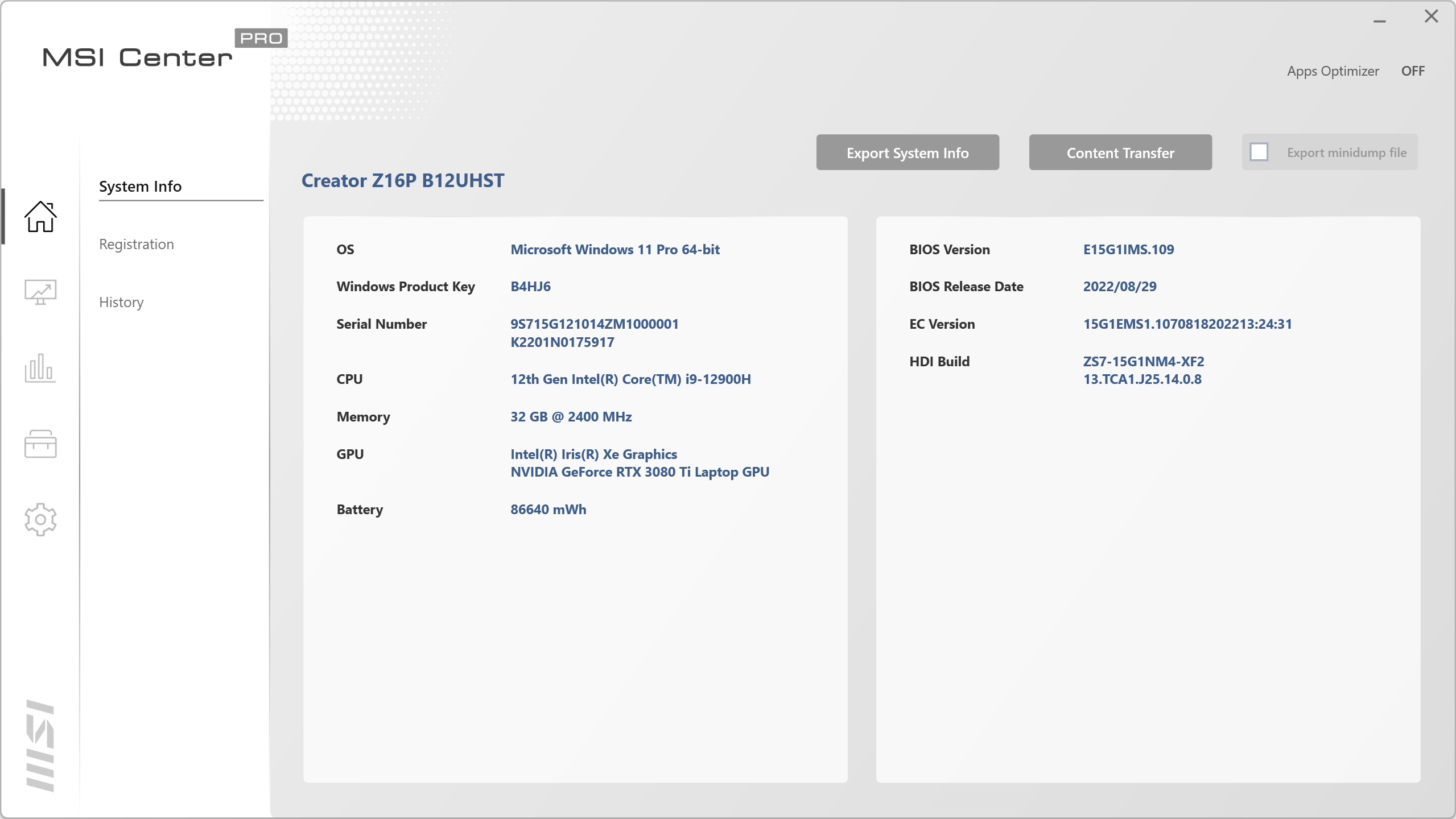 Het eerste scherm laat precies zien wat er in de laptop zit. De processor is te zien, het geheugen en de videokaart. Ook is te zien hoe oud de BIOS is en hoe sterk de accu is. Deze gegevens zijn te exporteren, mocht iemand deze informatie willen hebben. In het volgende scherm is het mogelijk de laptop te registreren om op deze manier updates te krijgen, snellere ondersteuning en de garantie te claimen (al loopt dat in Nederland via de reseller). Bij History zien we wat er allemaal gebeurd is. In dit geval was de software voor het eerst opgestart dus was er geen historie aanwezig.