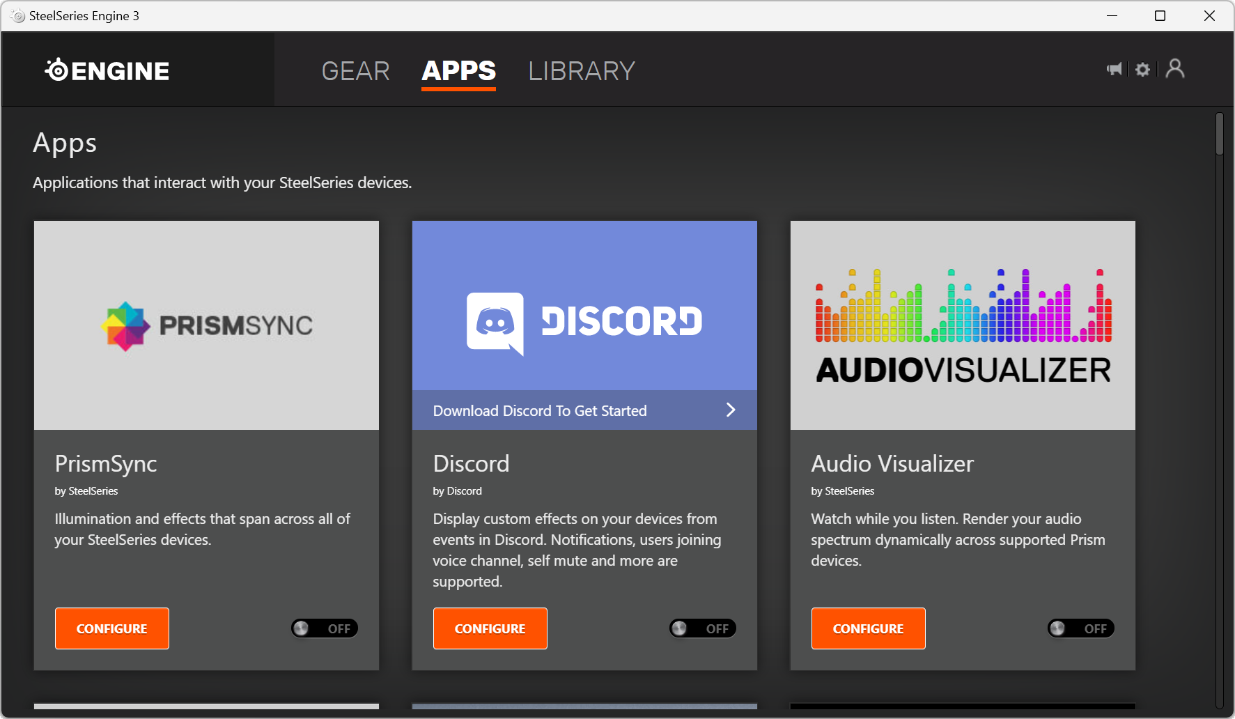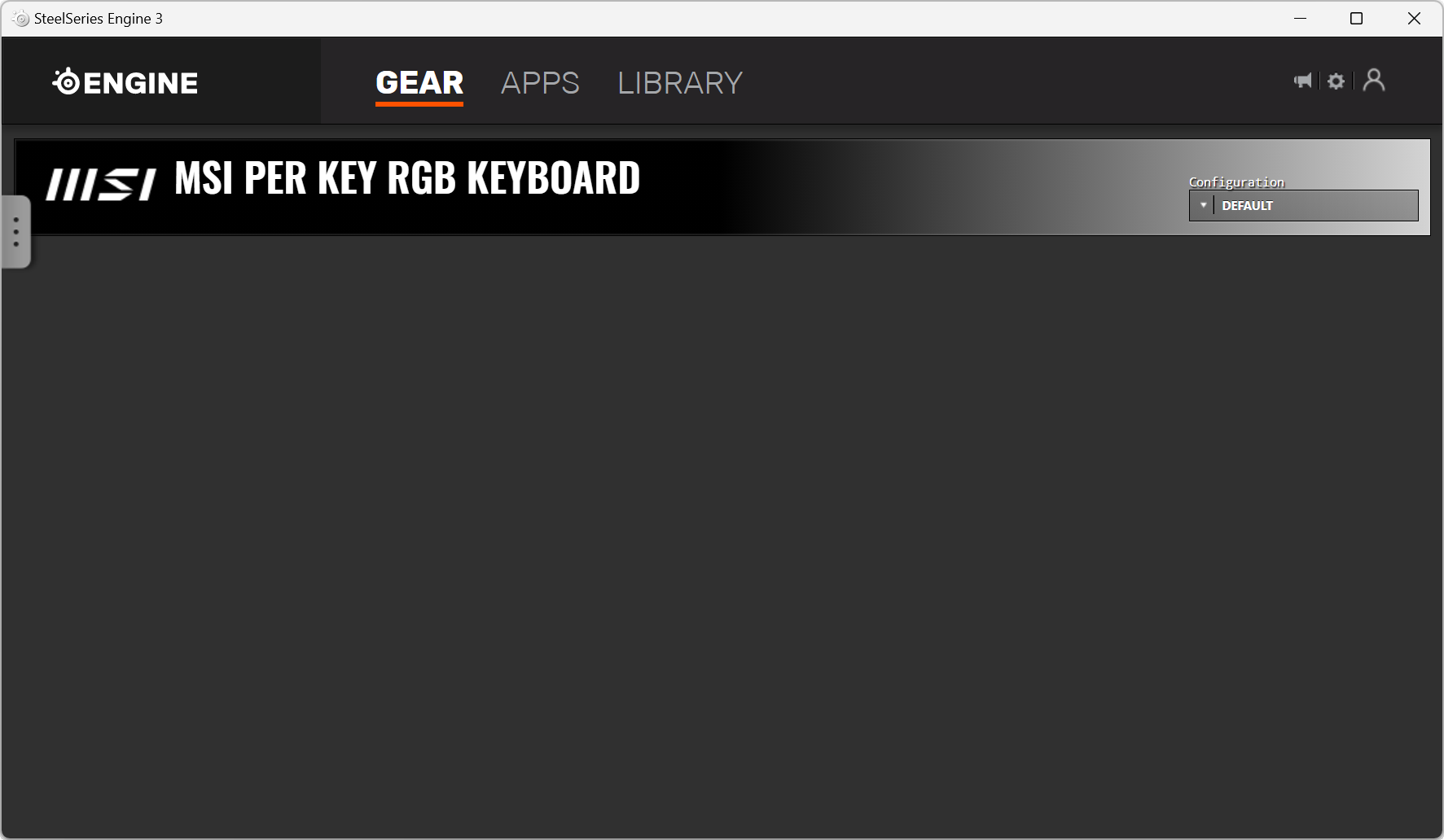 Als laatste hebben we de software van Steelseries. Hiermee kunnen een aantal zaken aangepast worden omtrent het toetsenbord. Dat is ook het enige onderdeel wat verschijnt in het scherm als de applicatie gestart wordt. In dit scherm kan al een preset gekozen worden voor de verlichting zodat de andere schermen niet eens bezocht hoeven te worden. Klik je op de balk van het toetsenbord dan komen daar wat meer opties naar voren. Als eerste komt er een scherm tevoorschijn met de verschillende key bindings. Hiermee is het mogelijk om met een toets of toetscombinatie een actie uit te voeren. Klik je op Illumination dan kan daar het licht van het toetsenbord aangepast worden. Als we in het hoofdscherm klikken op apps dan zien we daar verschillende programma's die samen kunnen werken met de Steelseries software. Denk hierbij aan Discord of de Audio Visualizer. Gelukkig is dit niet perse nodig. Als laatste hebben we de Library. Hierin staan spellen en applicaties die samen kunnen werken met de software en verlichting. Start je een spel wat hier staat dan worden automatisch de instellingen toegepast die eerder opgeslagen zijn.