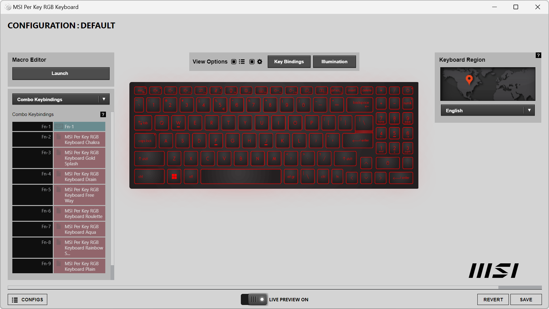 Het toetsenbord heeft standaard de verlichting niet aan staan maar het is wel mogelijk deze aan te zetten. Hiervoor kan de toets F8 gebruikt worden. Door meerdere malen op deze knop te drukken kan er door verschillende modi heen gebladerd worden. Ook is het mogelijk om de verlichting op deze manier weer uit te zetten, mocht je het toch vervelend vinden. Het is overigens ook mogelijk om de verlichting met de software aan te passen, daar later meer over.