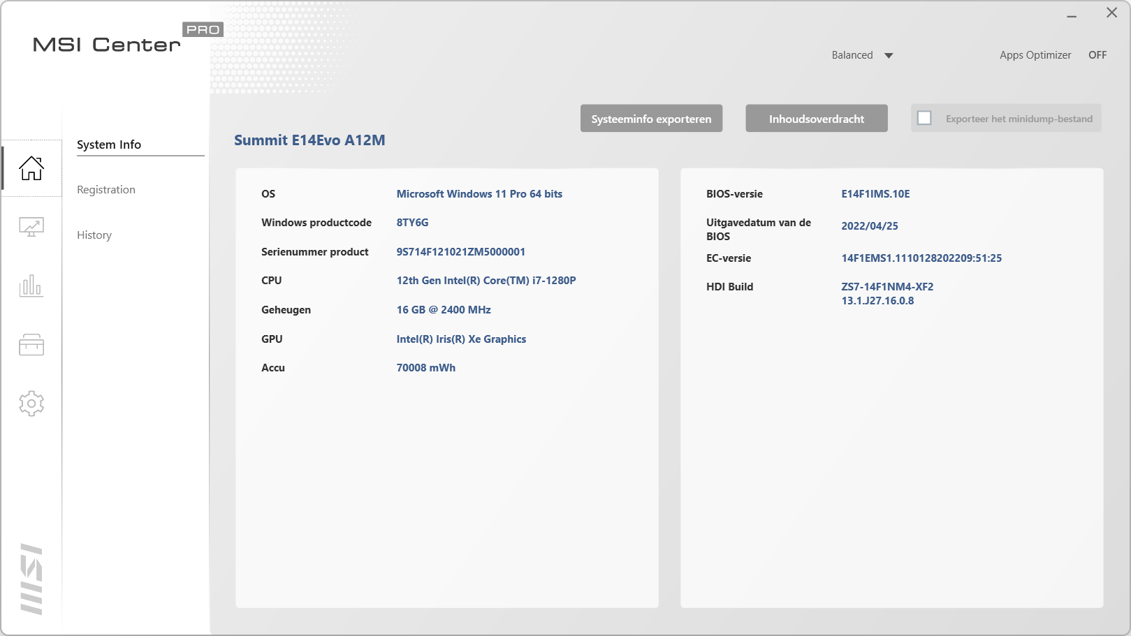 In het home scherm hebben we drie tabbladen. In het eerste tabblad staat de informatie van de laptop vermeld. Hier zien we ook dat het geheugen op 2400MHz draait ook al geven de specificaties iets anders aan. We zien de videokaart terug en de capaciteit van de accu. Als laatste wordt ook de BIOS versie weergegeven. In het volgende blad kan de laptop geregistreerd worden voor betere ondersteuning en garantie. Ook krijg je op deze manier nieuwsberichten gemaild. In het laatste tabblad staat de historie van de laptop. Gaan we naar de tweede knop dan komen we uit bij het optimalisatie centrum van MSI. Hier kan bepaald worden of je een gebalanceerde mode wilt draaien, de High Performance wat weer ten koste gaat van de accuduur en de Super Battery mode die juist de levensduur van de accu verlengt. In het volgende tabblad is de instelling van de batterij aan te passen. Het derde blad is voor de speakers en de microfoon. Hier kan de noise cancellation ingeschakeld worden die achtergrondgeluiden weg filtert als het nodig is. Met Smart Priority wordt bepaald welke programma's prioriteit krijgen tot de bronnen. Dit kan de laptop uiteraard ook zelf bepalen. Als laatste kan in Other Optimizer gekeken worden wat de status is van de schijf, het processorverbruik en de temperaturen van de verschillende onderdelen.