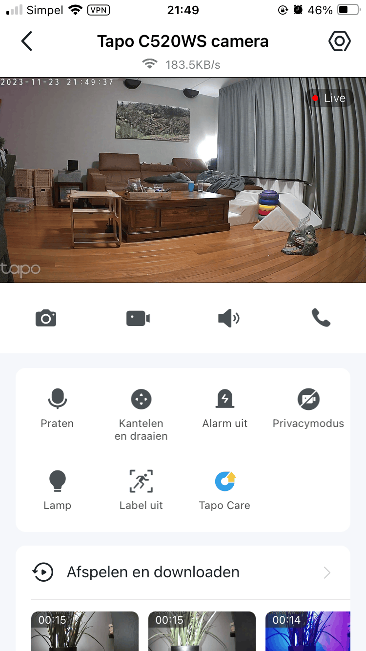 Uiteraard kan er worden teruggekeken, teruggespoeld, doorgespoeld en gepauzeerd worden. Het werkt allemaal erg intuïtief en vergt weinig uitleg. Ikzelf heb de opgenomen video's opgeslagen op een microSD kaart. In hetzelfde menu kan ook gewisseld worden naar de cloudopslag van Tapo, TP-Link. Ook kunnen er video's worden gedownload naar de microSD kaart. Deze kan dan in de app opgezocht worden onder het menu 'downloaden'. De afzonderlijke video's kunnen worden gedeeld (via Whatsapp of Instagram, Airdrop, opgeslagen op een NAS, etc). Ook kan er worden gekozen om een video op te slaan als favoriet. Deze krijgt dan in het overzichtsmenu (met alle video's) een blauw sterretje op de thumbnail zodat deze makkelijker kan worden herkend. Eveneens kan deze worden gedownload op het toestel naar keuze en kan de video worden verwijderd.