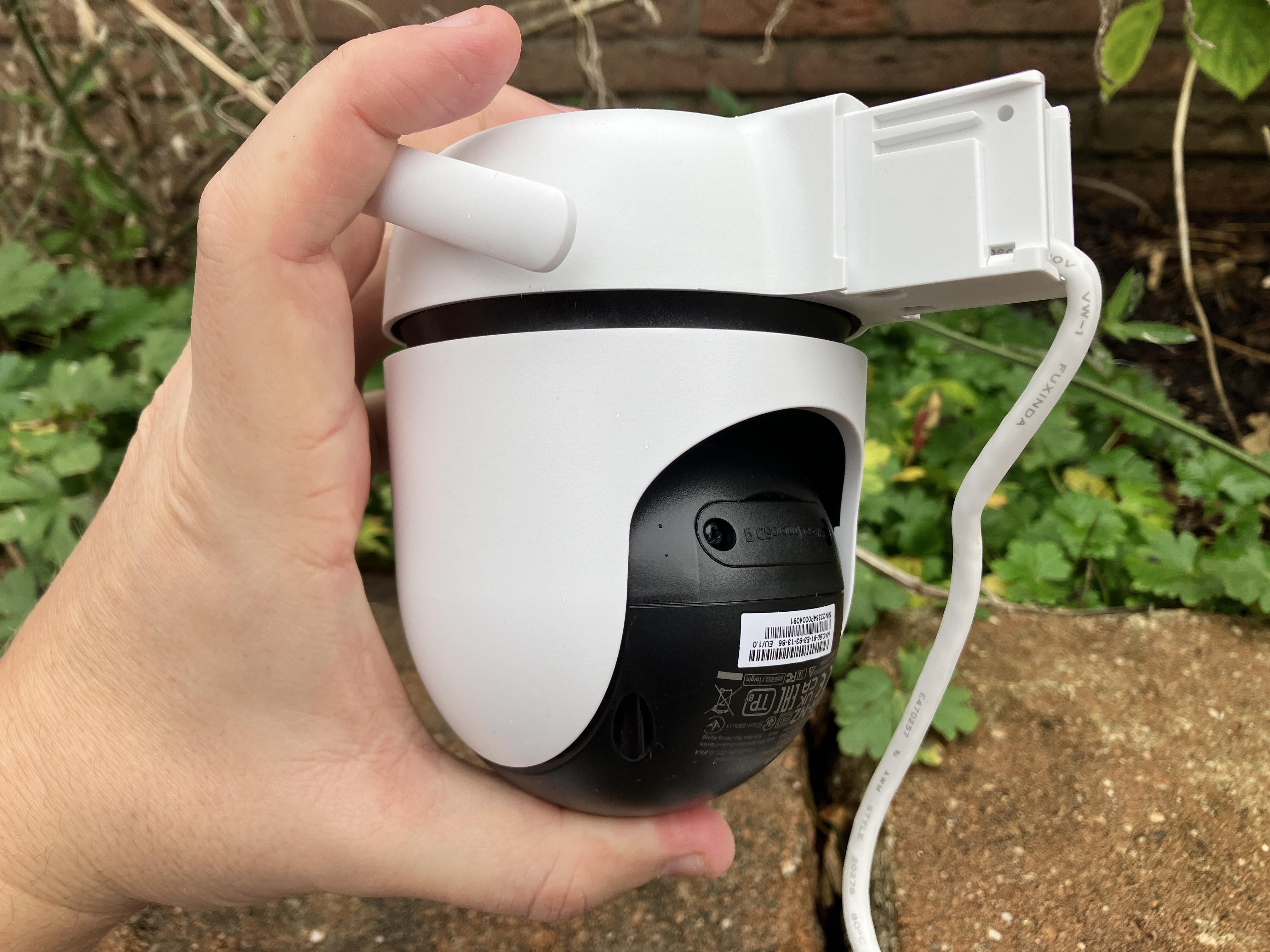 De bouw voelt degelijk aan. De camera is niet zwaar. Bij het flink schudden van de camera blijven alle onderdelen op hun plek hangen. Ook hoor ik geen gekke klikgeluiden bij het draaimechanisme van de camera. De camera zelf is overwegend gemaakt van gehard plastic wat weer helpt met het buitenhouden van water. Op de achterkant van de zwarte bol, zit een klepje. Hierachter kan een microSD kaart worden gedaan waardoor opgenomen beelden ook lokaal opgeslagen kunnen worden. De groottes die worden ondersteund door de camera gaan van 8GB tot 512GB en de 512 GB grootte biedt ongeveer 680 uur aan opgenomen 2K beeldmateriaal.