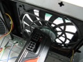 De bovenste 120mm fan (gentle typhoon pull) fungeert dus als inflow voor het cpu gedeelte van de kast en de onderste fan zal als inflow gelden voor het onderste gedeelte van de kast. Er is sprake van 2 delen omdat door de lengte van de 5850 de kast eigenlijk in 2 delen wordt opgesplitst.