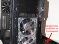 Deze case biedt een riante berg koelmogelijkheden. Standaard wordt hij geleverd met een 12cm-fan voorin, een 20cm-fan bovenin en een 12cm-fan achterin. Deze draaien allemaal op vrij lage speeds, waardoor de case heel stil is. Je kunt nog toevoegen: 1x 12cm voorin, 1x 12cm in het sidepanel, en als je de 20cm fan bovenin weghaalt: 2x 12cm bovenin. In mijn geval heb ik 2 extra fans toegevoegd, om een positieve luchtdruk te krijgen plaatste ik een extra 12cm-fan aan de voorkant, en eentje in het zijpaneel.