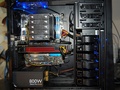 Ook valt er nog wat te zeggen over de ruimte voor overige componenten. De voeding allereerst, wordt onderin geplaatst. Er is een steunbalkje geplaatst voor de voeding, en deze kan door middel van 2 schroefjes onderop de case in diepte versteld worden, hetgeen je de vrijheid geeft om zowel kleine als grote voedingen te gebruiken. Ook voor de videokaart is behoorlijk wat ruimte overgelaten. Je kunt videokaarten van 30.5cm (12") plaatsen, voordat je in je HDD rack moet gaan zagen. De ATi HD 6970 die in dit geval gekozen was, heeft na inbouwen dus nog ruim voldoende speling.