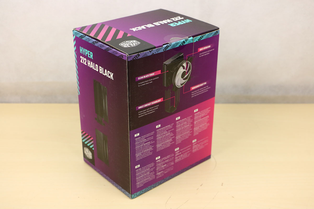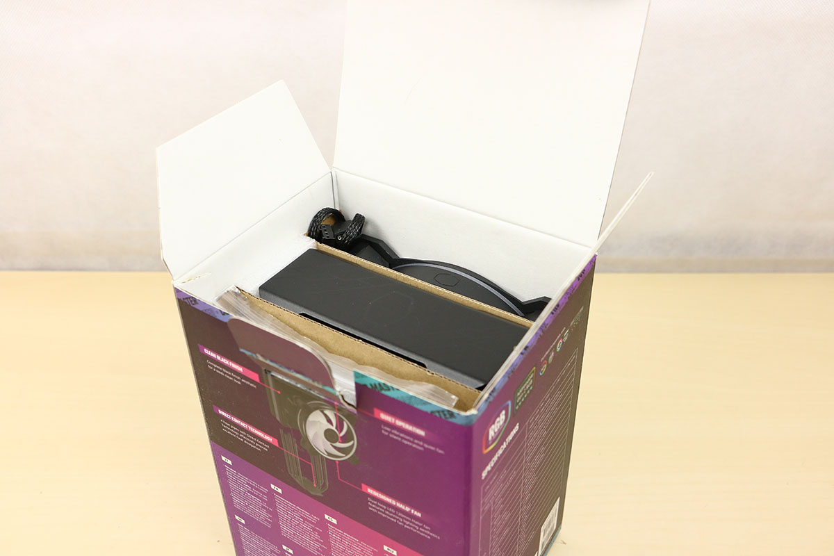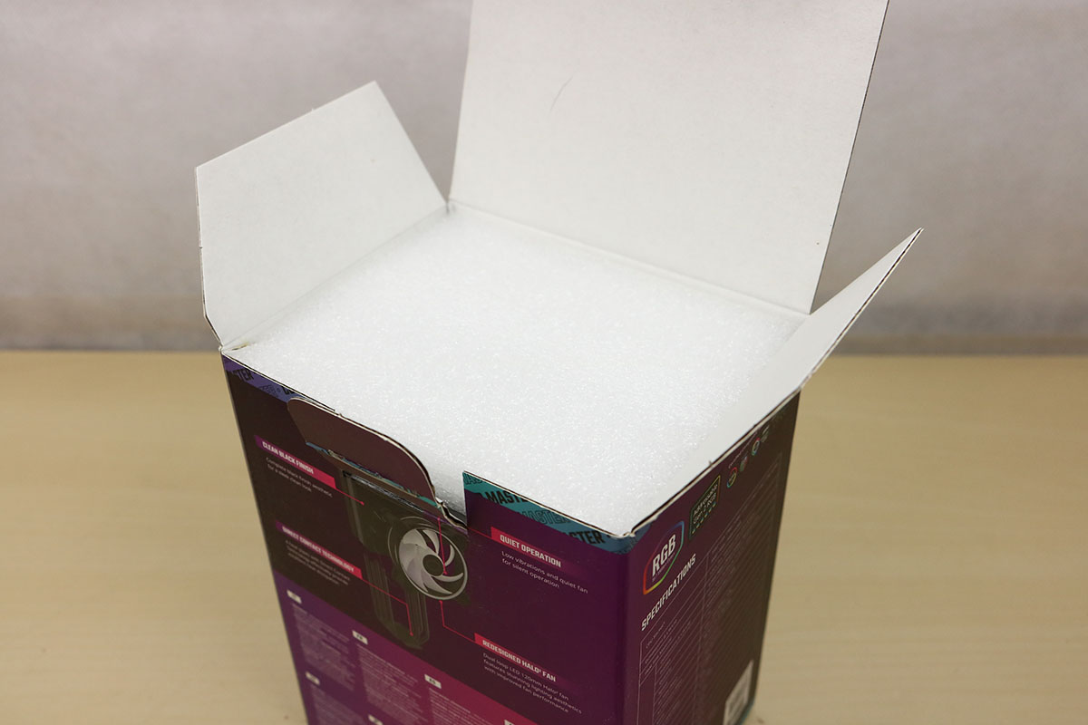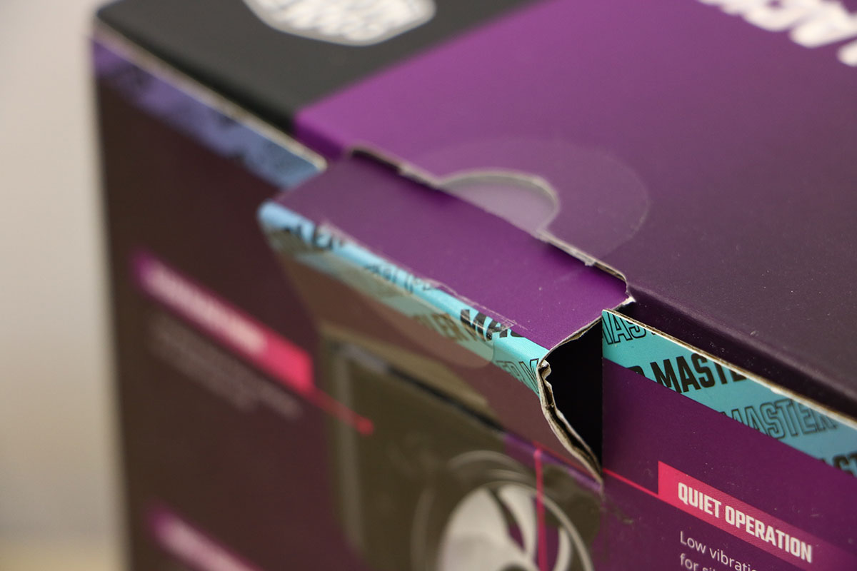 Net zoals de Black variant is deze doos in het paars uitgevoerd, de kleur die Cooler Master vaker gebruikt. Ook hier zien we weer dat de koeler op de verpakking staat met onderop de naam van de koeler samen met het merk (maar dat mag best duidelijk zijn). Op de achterkant van de doos staat wat uitleg van de verschillende onderdelen in maar liefst acht verschillende talen. Op de zijkant van de doos staat de koeler van de zijkant gefotografeerd met de naam erop. We maken de doos open door een flapje weg te trekken en het deksel op te liften. Bij deze koeler zien we een stukje schuim wat moet zorgen voor opvulling zodat de onderdelen niet in het rond slingeren.