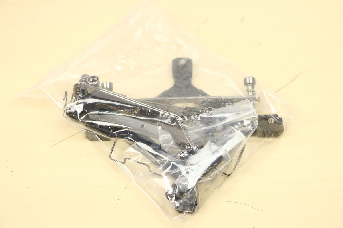 We gaan eerst het koelblok voorbereiden voor montage. Daarvoor levert Cooler Master een paar brackets mee en wij gaan de Intel variant monteren aangezien dit ons testplatform is. Dit zijn twee losse brackets die met twee schroefjes aan het koelblok vast worden gemaakt. Pak de juiste beugels en de twee schroefjes, draai het koelblok om en je kunt als je wilt de schroefjes al in de openingen leggen. Zet de beugel op de juiste manier tegen het koelblok aan en draai het schroefje vast. Doe dit aan beide kanten en het blok is klaar om gemonteerd te worden.