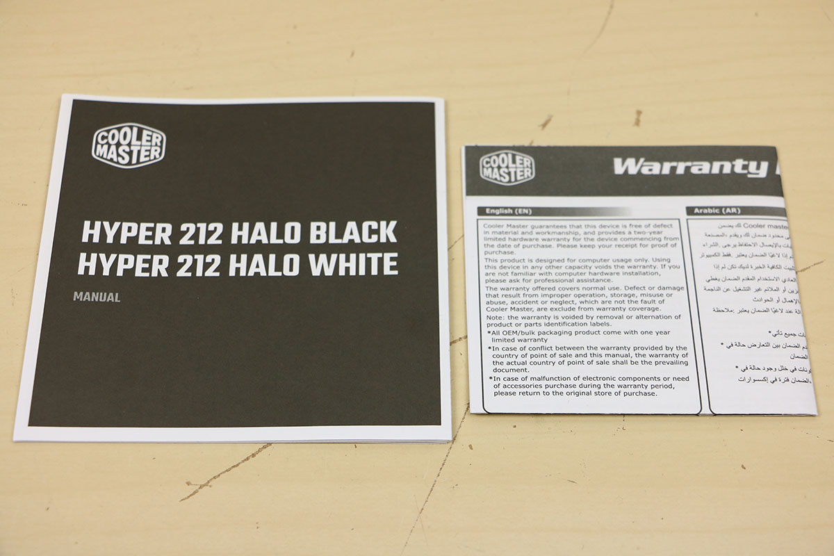 Als we het schuim weghalen dan zien we de verschillende delen die in de doos zitten. Te zien zijn de koeler, de ventilator en een plastic zakje. In het plastic zakje zitten de accessoires om de koeler te kunnen monteren en eventueel te voorzien van een tweede ventilator. Hier zien we ook de Intel backplate. Het AMD gedeelte is van het bracket geschrapt wat inbouwen makkelijker maakt, je hoeft immers niets meer aan te passen. Tevens zitten er wat schroeven bij en koelpasta. Uiteraard mag het nodige papierwerk niet ontbreken. Ook zit, in tegenstelling tot de Hyper 212 Black, de ventilator nog niet op de koeler maar wordt deze los geleverd in de doos. Je zult deze zelf nog moeten aanbrengen. Er zitten twee kabels aan de ventilator: één die zorgt dat hij rond draait en de ander voor het aansturen van de verlichting.