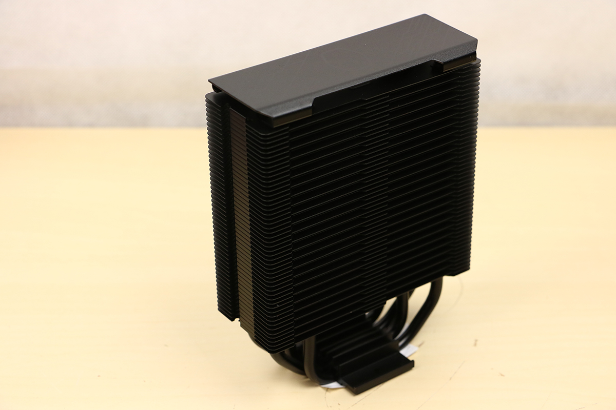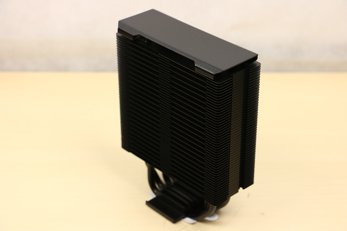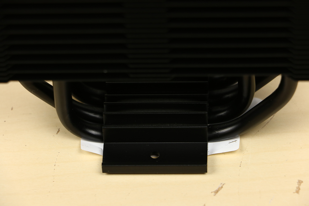 We leggen de accessoires aan de kant en gaan eens kijken naar de koeler zelf. Het valt inderdaad op dat het geheel compleet zwart is. Er is geen spatje kleur te bekennen. Zelfs het logo aan de bovenkant is in het zwart uitgevoerd dus de kleur moet echt niet van de koeler afkomen, daar is uiteindelijk de ventilator voor. We zien ook nergens rubbers zitten om de ventilatoren tegenaan te plaatsen, deze komen dus rechtstreeks op het koelblok terecht. In dit geval zorgen de rubbers van de ventilatoren ervoor dat er geen trillingen doorgestuurd worden naar het koelblok en de rest van het systeem. We zien aan de bovenkant ook geen uiteindes van heatpipes, iets wat we bij de Black variant wel zagen. Deze zijn nu afgedekt wat beter is voor het uiterlijk. De heatpipes lopen echter wel door het blok heen naar beneden. Daar vinden we de coldplate waar de warmte van de processor wordt opgepikt en doorgegeven aan de pijpjes.
