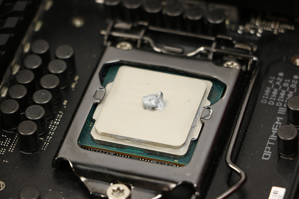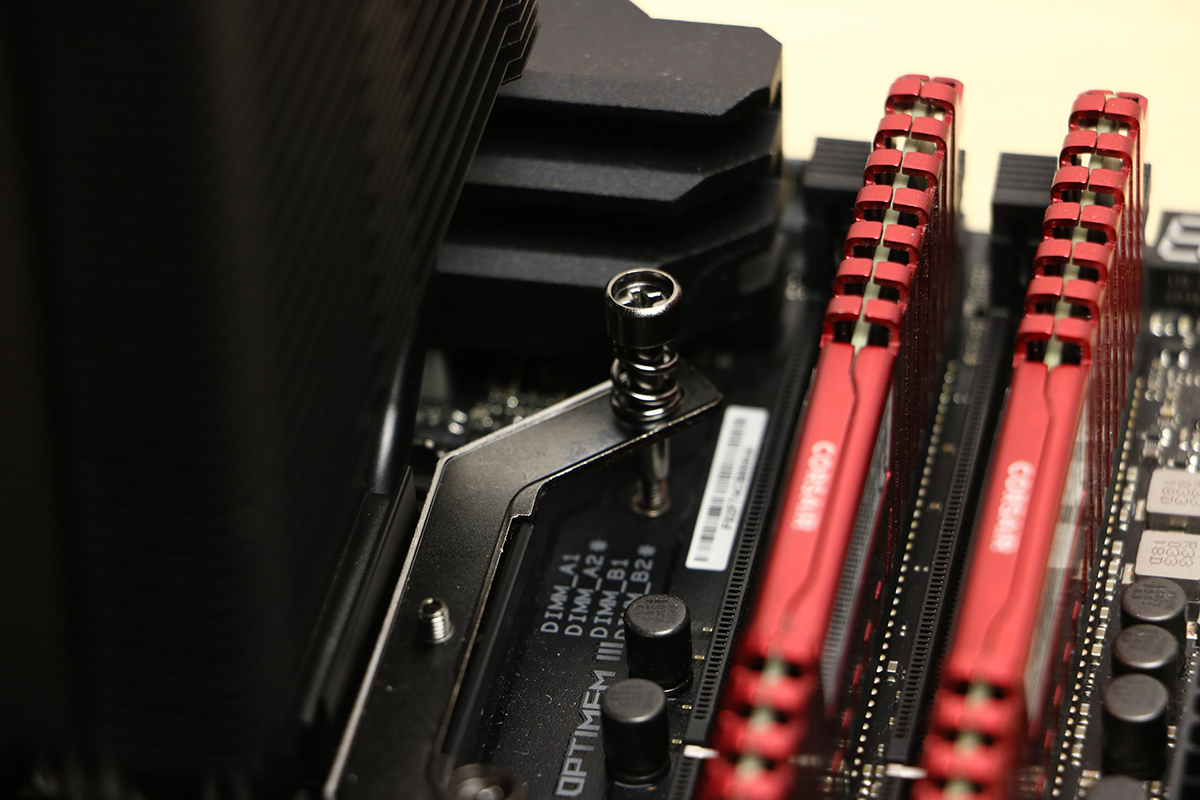 Voordat we het koelblok vastzetten moeten we de processor nog voorzien van wat koelpasta. Deze vult de kleine openingen op tussen de processor en de koeler. Deze kunnen heel erg klein zijn en dan zorgt de pasta voor een betere doorgifte van de warmte. Als dit gedaan is kunnen we het blok op het bord zetten. Welke kant boven of onder is maakt hier niet uit. Daarna kunnen de schroeven vastgedraaid worden. Doe dit op een kruislingse manier zodat de koeler niet scheef komt te zitten. Te strak vastdraaien is niet mogelijk, je kunt doordraaien tot je niet meer kunt. Doe dit niet in één keer maar draai een aantal slagen per schroef per keer. Daarna is het zelfs mogelijk om het moederbord aan de koeler op te tillen.