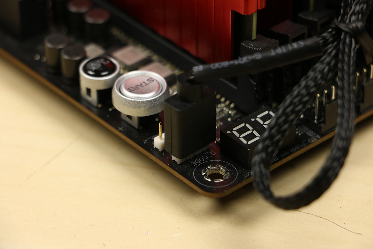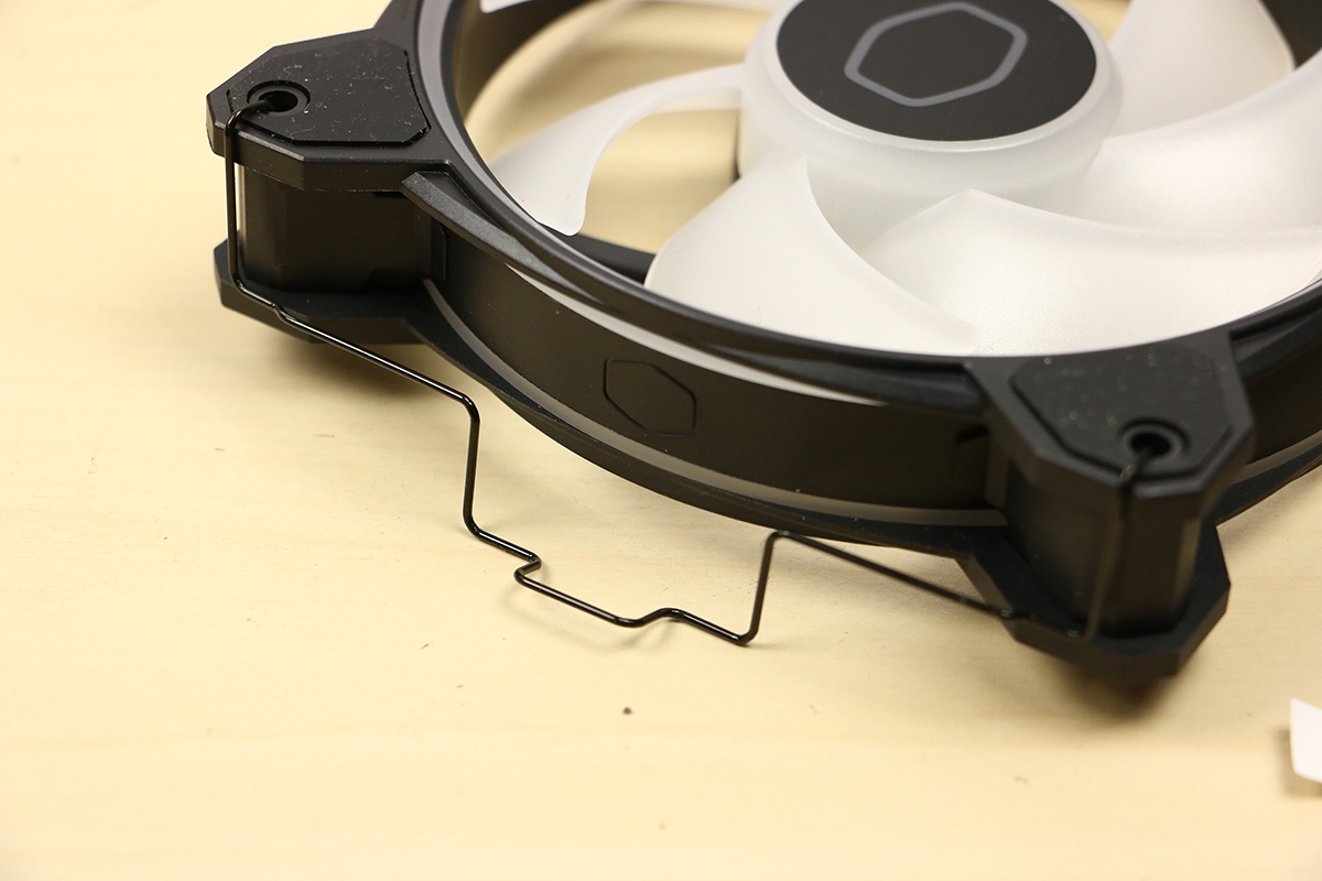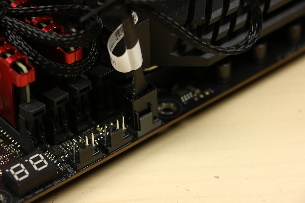 Dan zijn er nog twee dingen die we moeten doen: de ventilator op het koelblok vastzetten en de ventilator voorzien van stroom en aansturing van het licht. Er worden twee clips geleverd die op de ventilator gehaakt moeten worden, aan elke kant één clip. Deze zitten een beetje stroef maar dat is geen enkel probleem. Let er wel op dat je de clips aan de juiste kant van de ventilator plaatst. De kant met het logo wil je aan de buitenkant van het blok hebben zitten zodat lucht door het blok heen kan blazen. Wanneer dit gedaan is kan de ventilator tegen het blok aan en de clips haken in de zijkant van het blok. Dit kan wat kracht kosten maar de beugels zijn flexibel. Daarna moeten we de PWM connector op de juiste aansluiting van het bord prikken zodat de ventilator kan ronddraaien en sluiten we de RGB connector aan zodat de ventilator ook wat licht kan geven, wel één van de features van deze koeler.