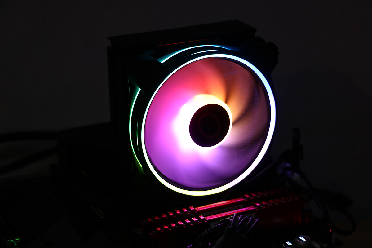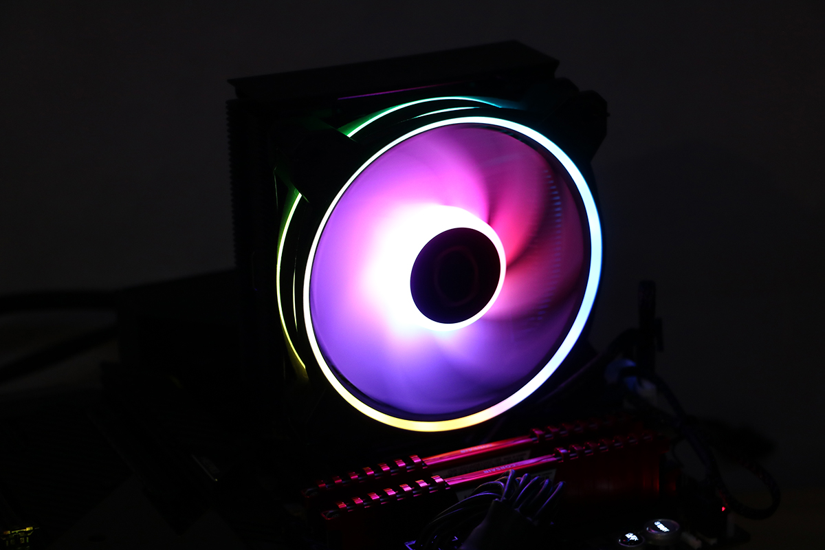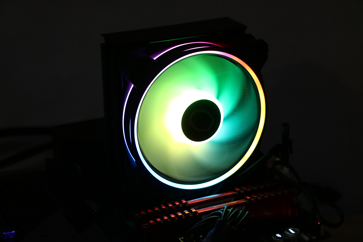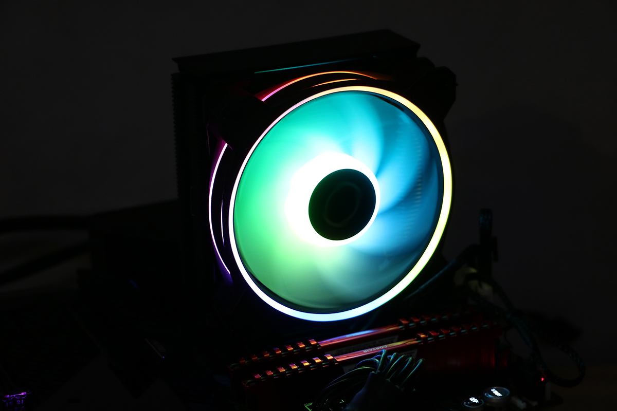De verlichting van de ventilator ziet er erg netjes uit. Het spectrum laat alle kleuren zien wat je maar wilt en past zich aan aan de instellingen van het moederbord. Uiteraard kun je er ook voor kiezen om gebruik te maken van een controller maar dit hoeft niet eens. Het gebruikte bord van Asus weet de ventilator van Cooler Master van de juiste profielen te voorzien om er een leuk geheel van te maken, wel zo handig als je van een beetje kleur in je systeem houdt.