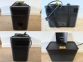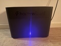 Zoals je op bovenstaande afbeelding kunt zien, zit er op de voorkant een ronde knop. Deze knop gebruik je enkel met de eerste installatie. Net boven de LED lampjes. Aan de linker zijkant zit een ventilatierooster met aan de onderkant een aan-en uitknop, aan de achterkant zit aan de bovenkant ook twee ventilatieroosters en aan de rechterzijkant ook nog hetzelfde ventilatierooster.