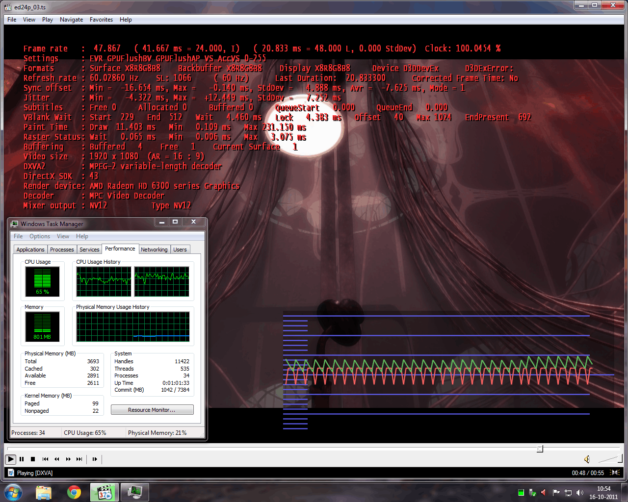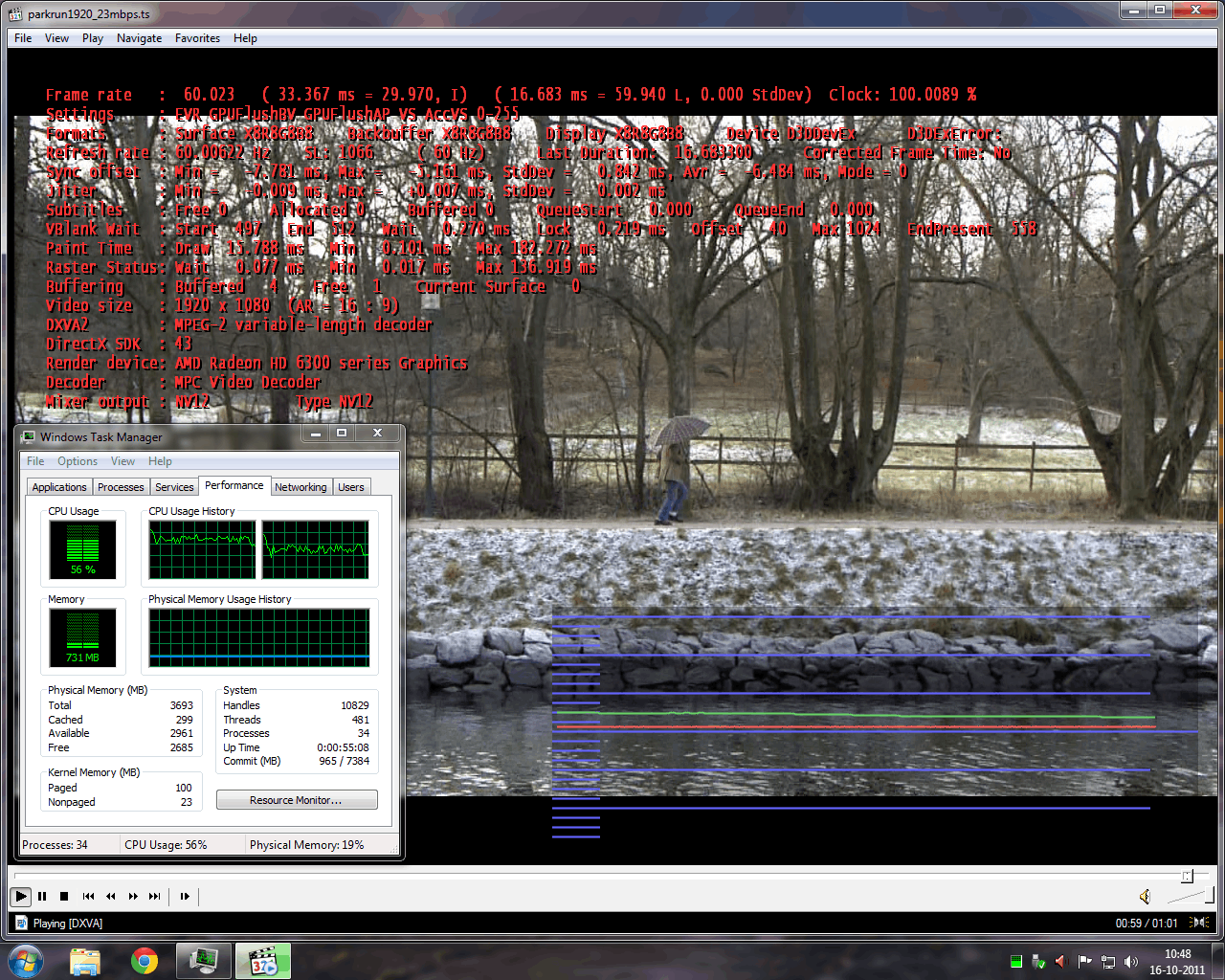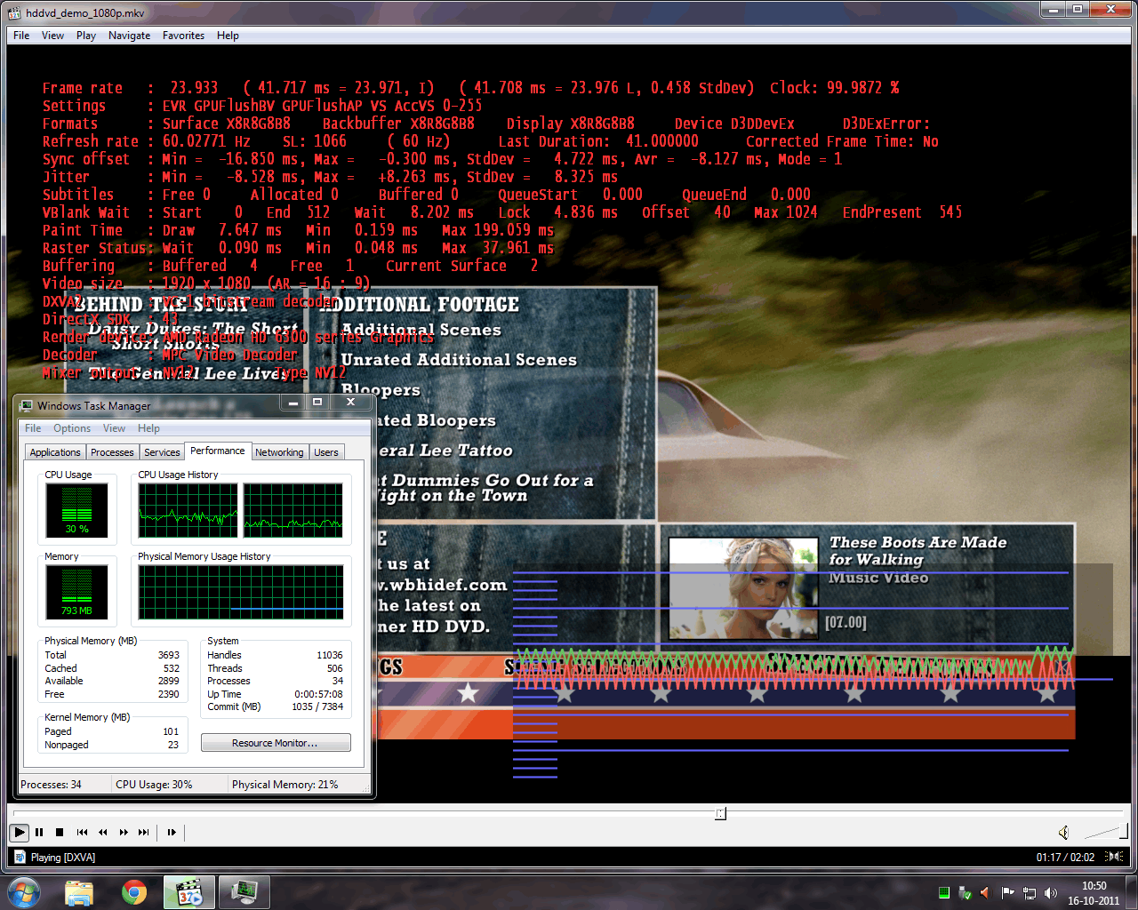Alles speelt vloeiend, belasting van de CPU is met 1080i mpeg2 rond de 50%, met 1080p mpeg2 rond de 50-60% en bij 1080p vc1 rond de 30%