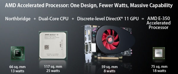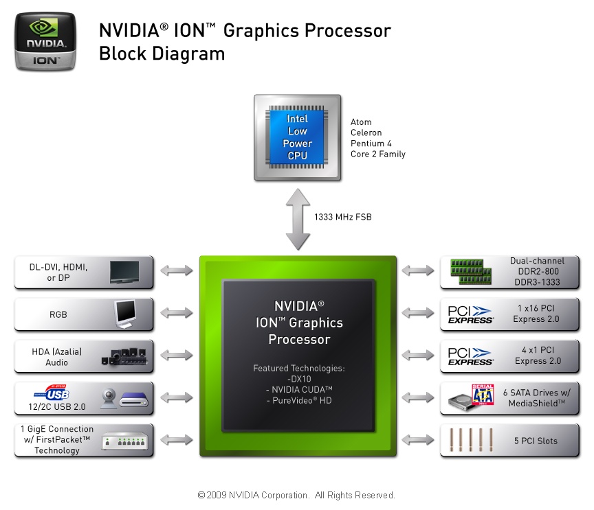 Hoe zit dat met ION? Hier gebruiken ze een bestaand low power CPU (een Intel Atom) met daarnaast een Northbridge en DX10 GPU combo chip van nVidia:
