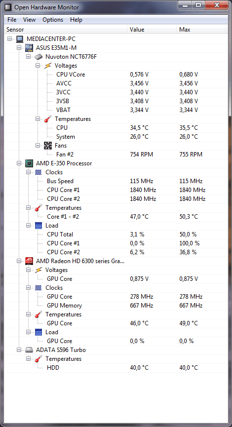 Hier de waardes van Open Hardware Monitor: