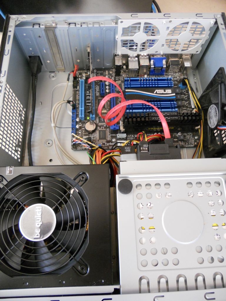 Temperaturen lopen als het systeem overclocked is zonder fan erg snel op (+- 85C zonder directe koeling) ik heb daarom een 120MM fan aan de zijkant van de kast zitten, deze blaast de lucht door de kast en daarom langs de heatsink, verder zitten er geen fans in de kast.