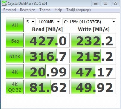 500 MB/s -> 315 MB/s. Bij een 300 SATA zijn de read en de write bijna gelijk: 265 MB/s -> 240 MB/s.