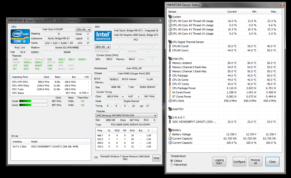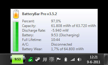 Met 63720mWh is hij iets kleiner dan de batterij in de UL30, alleen de SandyBridge CPU kan zuiniger zijn doordat deze veel sneller en vaker veranderd van verbruik. BatteryBar Pro gokt nu al dat ik bijna 10uur kan doen met mijn batterij als het verbruik op -5940mWh blijft. In de praktijk loopt dit vaak op naar -11000mWh dus 6~ 7uur is reeeler. Overigens geld dit alleen voor het gebruik van Wifi en de ena laagste brightness zonder het gebruik van de Optimus. Dus puur webbrowsen en office gebruik.