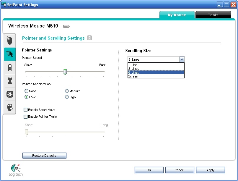 http://tweakers.net/ext/f/I9gVKzuboASERSj1liSPT2p7/thumb.jpg Hier kan je aanpassingen maken van de aanwijzer en het scrollen. Enige wat ik vreemd vind is dat het scrollen beperkt is tot 4 opties, terwijl je bij Windows standaard meer opties krijgt in het aantal regels scrollen. Het is wel zo als je eenmaal bij Windows een andere aantal opgeeft deze ook in Setpoint wordt opgenomen. "Smart Move" springt je aanwijzer automatisch naar een van de klikbare knoppen in een nieuw venter, welke dus ook bij Windows standaard zit inbegrepen.