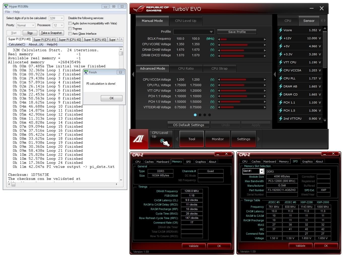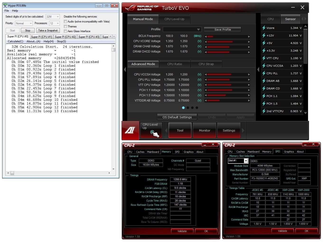 Zoals hierboven reeds vermeld zijn we voor het overclocken van het geheugen voor een zeer groot deel afhankelijk van de IMC in de CPU. Het geheugen zit zeker nog niet aan de max, de IMC helaas wel. HyperPI is gebruikt om de stabiliteit van het geheugen te testen door tegelijkertijd 12x een SuperPI 32M berekeningen uit te voeren.