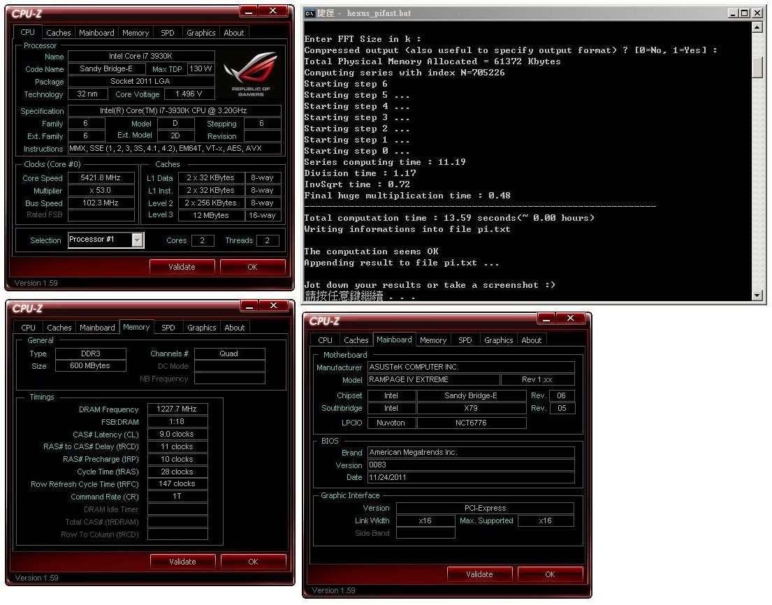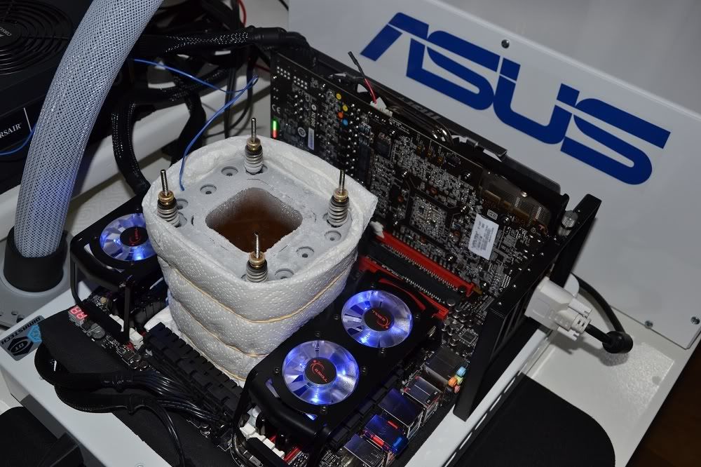 Ter afsluiting is het moederbord voorzien van een LN2 pot om de CPU mee te koelen en is de spanning voor het geheugen verder verhoogd naar ongeveer 1.70v voor de laatste OC tests. CPU is ingsteld op ~ 5400mhz en geheugen op ~ 1225mhz 9-11-10-28-1T.