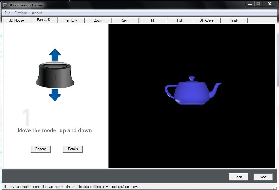 Na het installeren van de drivers wordt geadviseerd de trainingsmodule te starten, die je wegwijs moet maken met het apparaat. In een aantal eenvoudige stappen worden alle bewegingsassen geïntroduceerd.