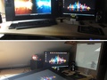 Links de 24inch Cintiq, rechts een 21inch Acer monitor. De Cintiq oogt veel groter door de brede randen met shortcuts. Er is net voldoende ruimte voor een toetsenbord tussen de voet en monitor van de cintiq te plaatsen.